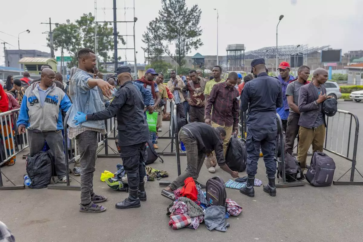 Rwanda security officials check people crossing from Congo in Gisenyi, Rwanda Rwanda, Wednesday, Jan. 29, 2025, following M23 rebels' advances into eastern Congo's capital Goma. (AP Photo/Brian Inganga)