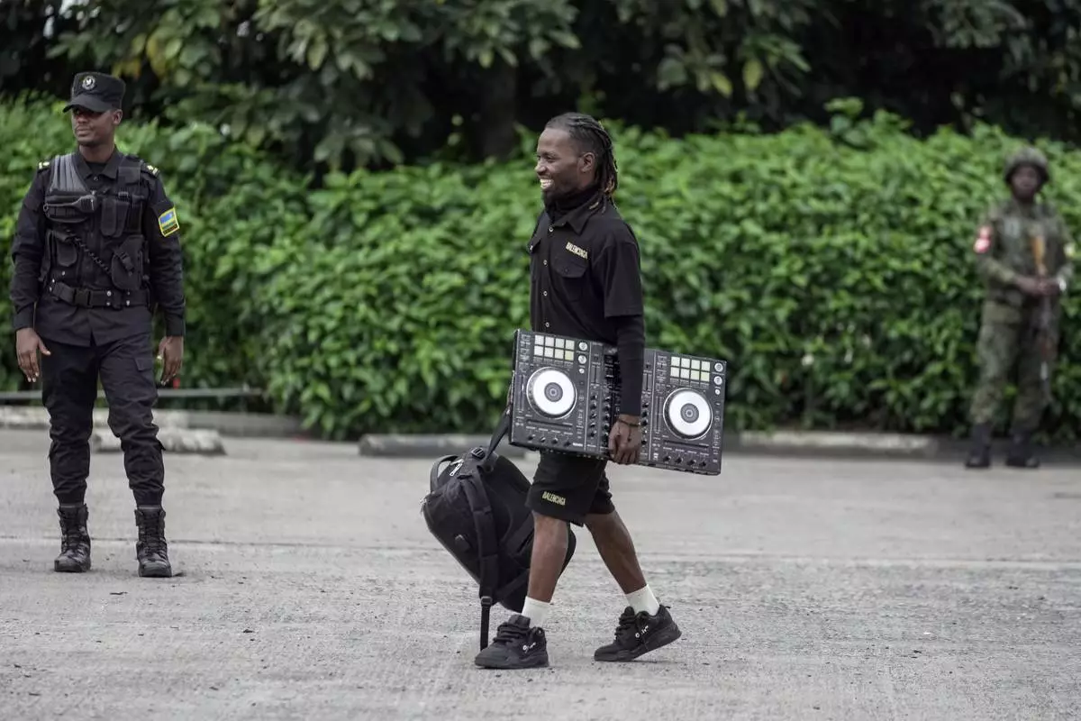 A man carries a Turntable as Rwanda security officials check people crossing from Congo in Gisenyi, Rwanda, Wednesday, Jan. 29, 2025, following M23 rebels' advances into eastern Congo's capital Goma. (AP Photo/Brian Inganga)
