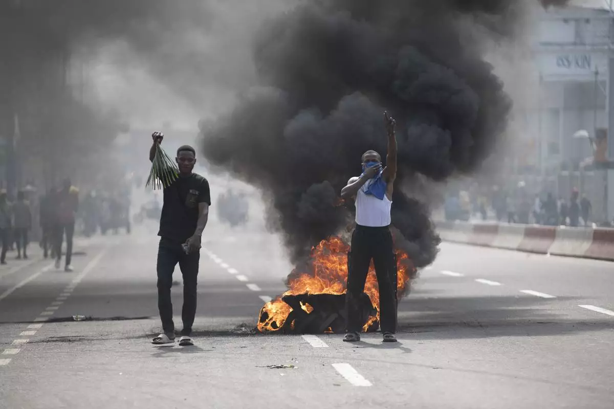 People protest in Kinshasa, Democratic Republic of the Congo Tuesday, Jan. 28, 2025, against the Rwanda-backed M23 rebels' advances into eastern Congo's capital Goma. (AP Photo/Samy Ntumba Shambuyi)