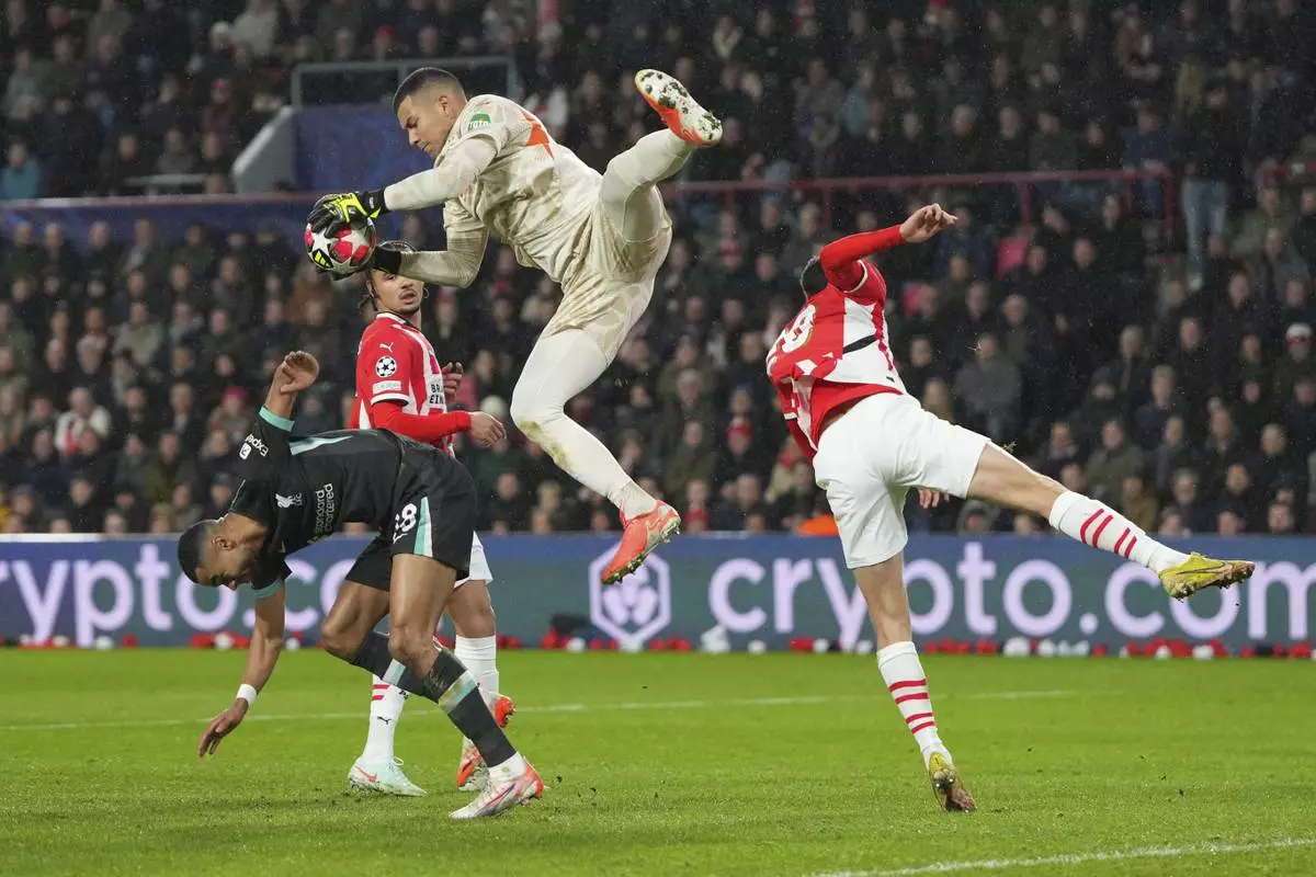 PSV's goalkeeper Walter Benitez saves over Liverpool's Cody Gakpo during the Champions League opening phase soccer match between PSV and Liverpool at Phillips Stadium in Eindhoven, Netherlands, Wednesday, Jan. 29, 2025. (AP Photo/Peter Dejong)