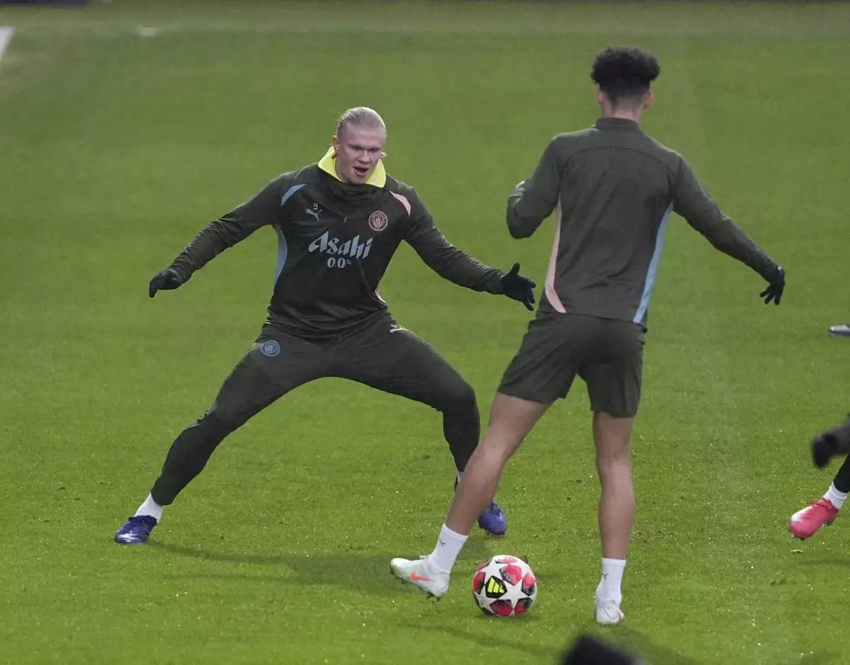 Manchester City's Erling Haaland, left, attends a training session in Manchester, England, Tuesday Jan. 28, 2025, ahead of the Champions League soccer match between Manchester City and Club Brugge KV. (Martin Rickett/PA via AP)