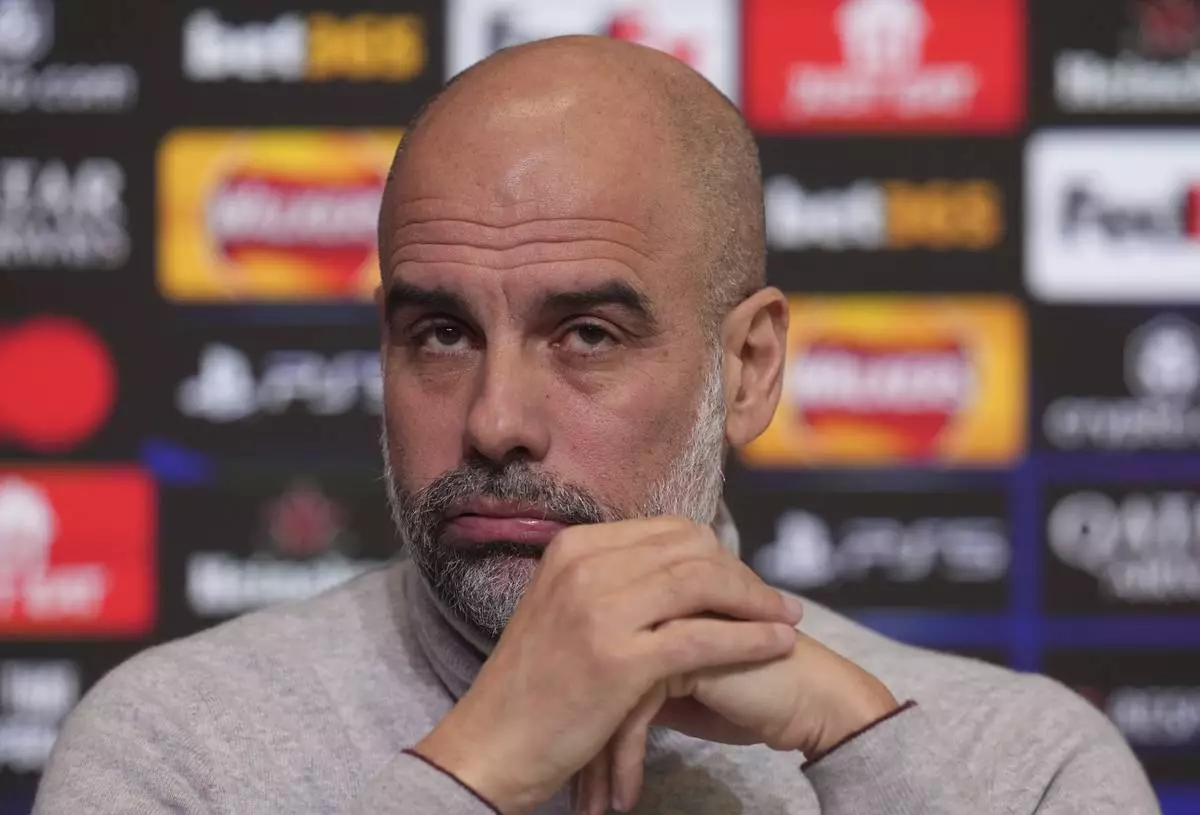Manchester City manager Pep Guardiola reacts during a press conference at the City Football Academy in Manchester, England, Tuesday Jan. 28, 2025. (Martin Rickett/PA via AP)