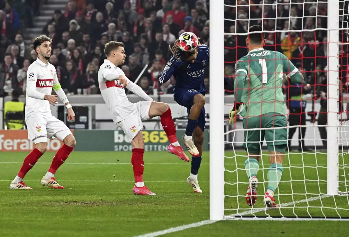 PSG's Bradley Barcola, centre right, scores the opening goal past Stuttgart's goalkeeper Fabian Bredlow during the Champions League opening phase soccer match between VfB Stuttgart and Paris Saint-Germain in Stuttgart, Germany, Jan. 29, 2025. (Marijan Murat/dpa via AP)