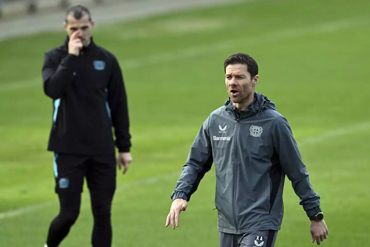 Leverkusen's head coach Xabi Alonso, right, during a training session in Leverkusen, Germany, Tuesday, Jan. 28, 2025 ahead of the Champions League soccer match between Bayer 04 Leverkusen and AC Sparta Praha. (Federico Gambarini/dpa via AP)