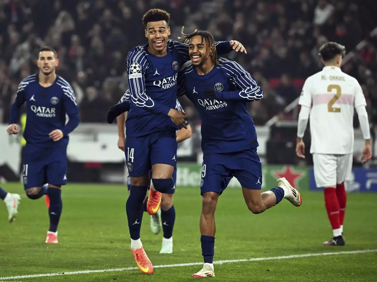 PSG's Bradley Barcola, centre right, celebrates with Desire Doue after scoring the opening goal during the Champions League opening phase soccer match between VfB Stuttgart and Paris Saint-Germain in Stuttgart, Germany, Jan. 29, 2025. (Marijan Murat/dpa via AP)