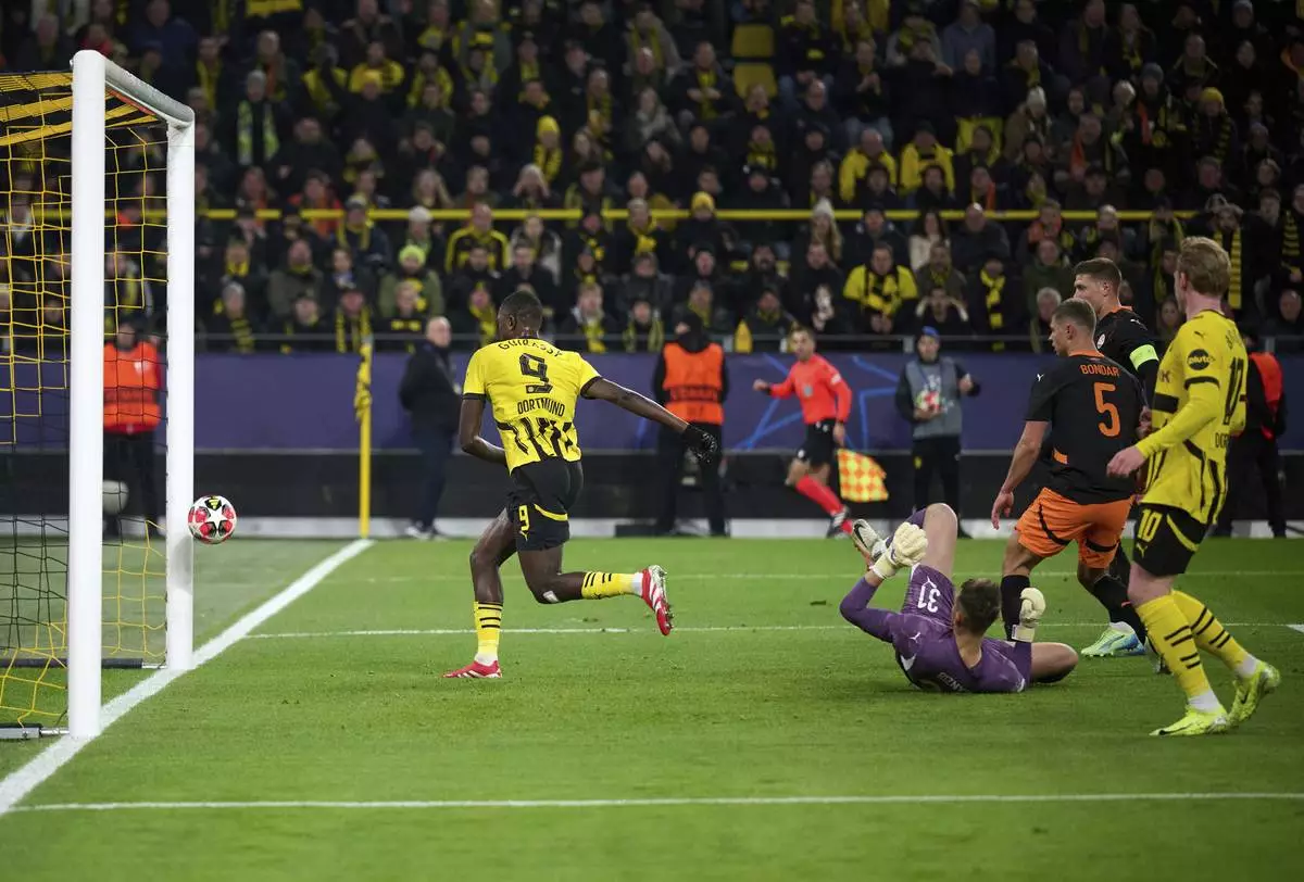 Dortmund's Serhou Guirassy scores the opening goal during the Champions League opening phase soccer match between Borussia Dortmund and Shakhtar Donetsk in Dortmund, Germany, Jan. 29, 2025. (Bernd Thissen/dpa via AP)