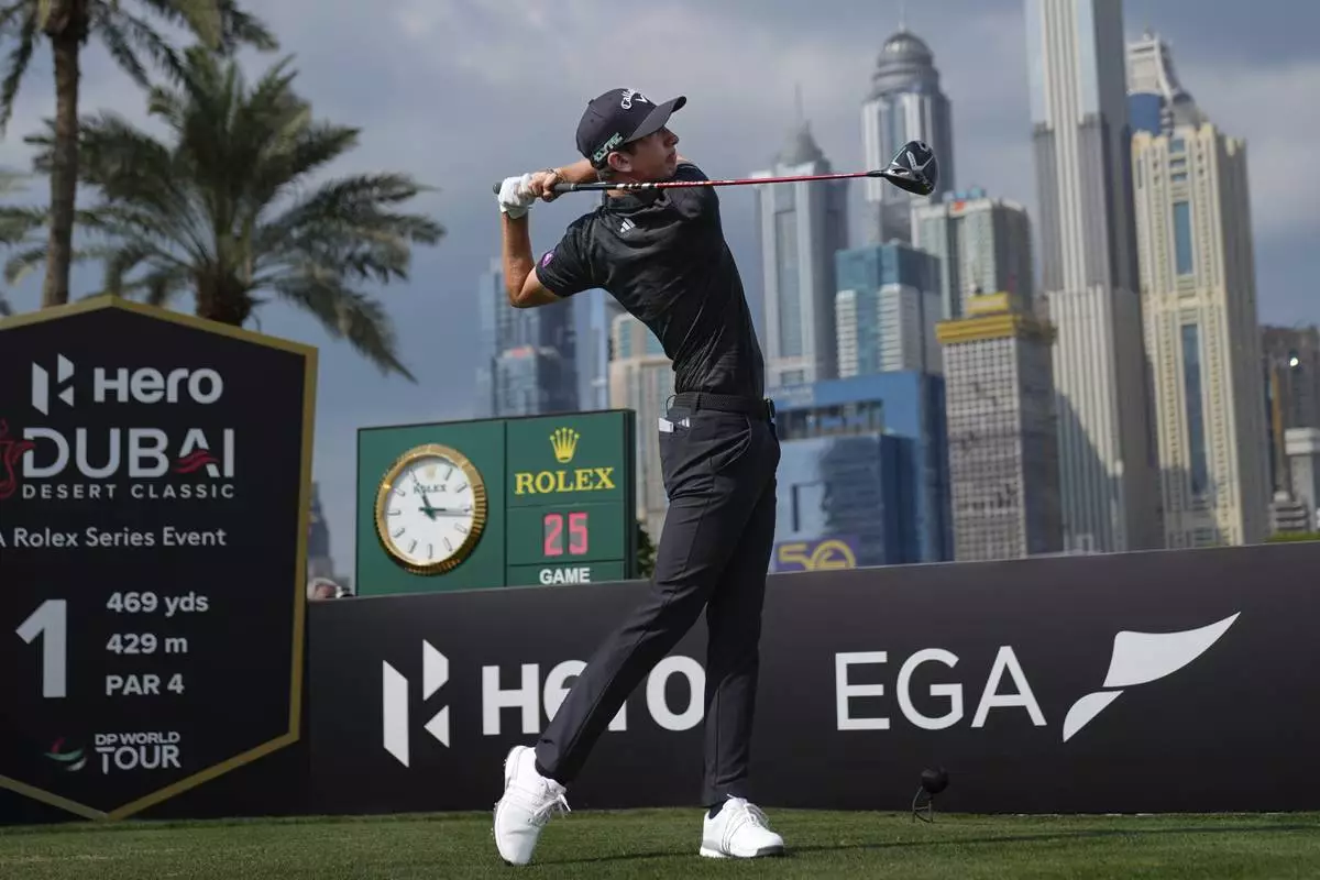 Tom Mckibbin of Northern Ireland hits off the first tee during the final round of the Dubai Desert Classic golf tournament, in Dubai, United Arab Emirates, Sunday, Jan. 19, 2025. (AP Photo/Altaf Qadri)