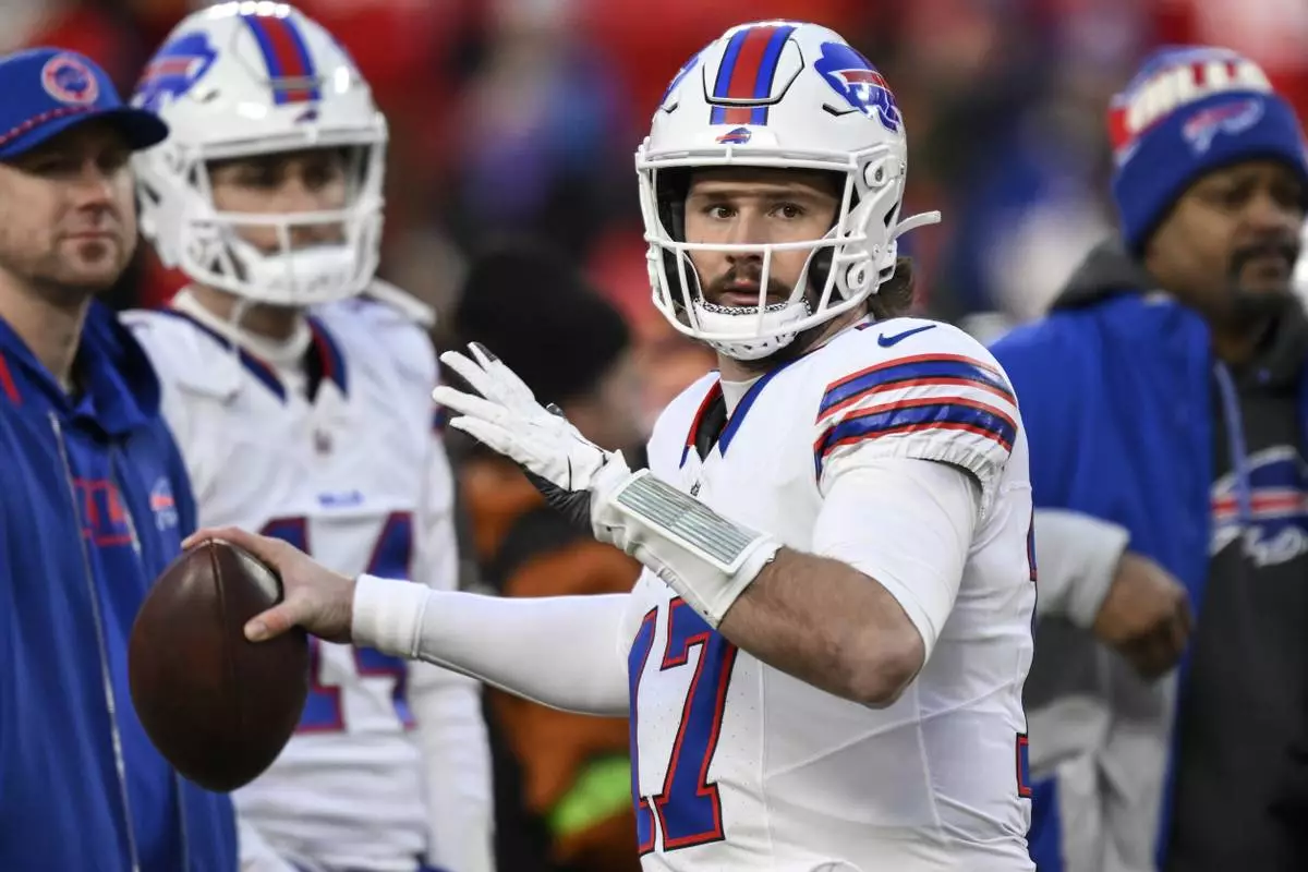 Buffalo Bills quarterback Josh Allen (17) warms up before the AFC Championship NFL football game against the Kansas City Chiefs, Sunday, Jan. 26, 2025, in Kansas City, Mo. (AP Photo/Reed Hoffmann)