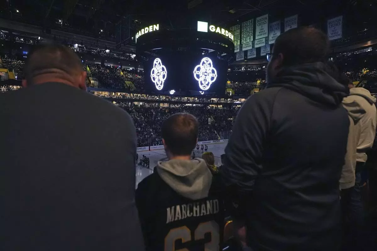 Members of the Skating Club of Boston community, athletes, coaches and family who were killed when an American Airlines flight collided with an Army helicopter Wednesday, Jan. 29, 2025, and crashed into the Potomac River in Washington, are honored prior to an NHL hockey game between the Boston Bruins and Winnipeg Jets, Thursday, Jan. 30, in Boston. (AP Photo/Charles Krupa)