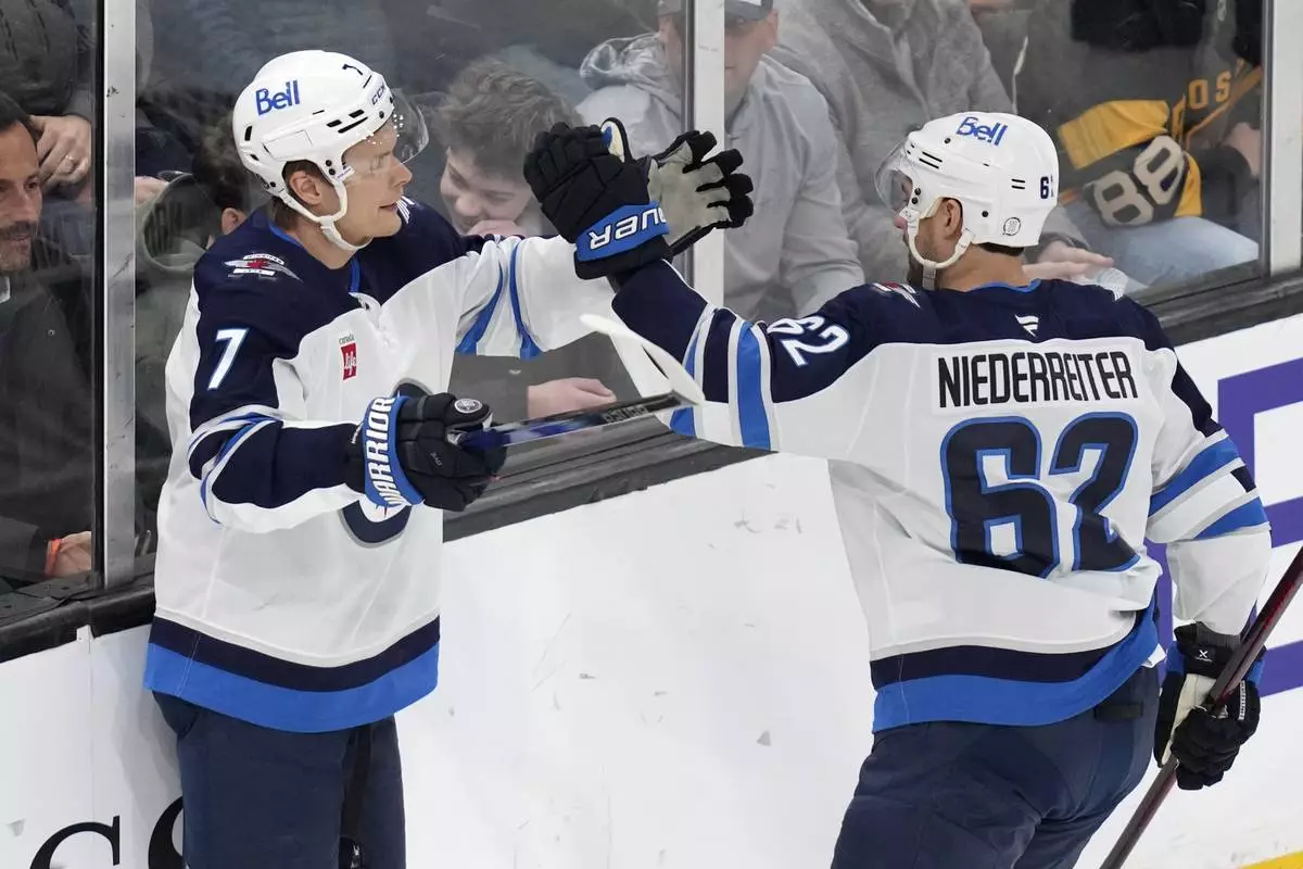 Winnipeg Jets center Vladislav Namestnikov (7) is congratulated by Nino Niederreiter (62) after his goal against Boston Bruins goaltender Joonas Korpisalo during the first period of an NHL hockey game, Thursday, Jan. 30, 2025, in Boston. (AP Photo/Charles Krupa)
