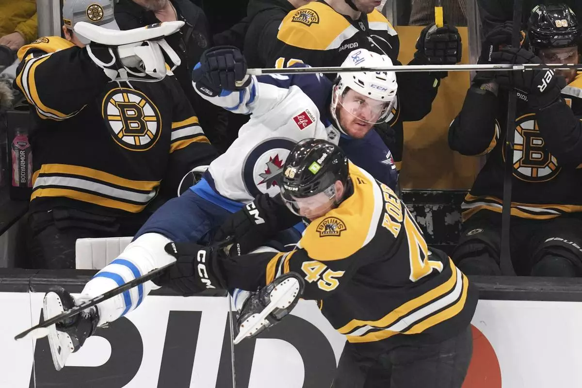 Winnipeg Jets defenseman Dylan Samberg, left, is checked into the Bruins bench by Boston Bruins left wing Cole Koepke (45) during the second period of an NHL hockey game, Thursday, Jan. 30, 2025, in Boston. (AP Photo/Charles Krupa)