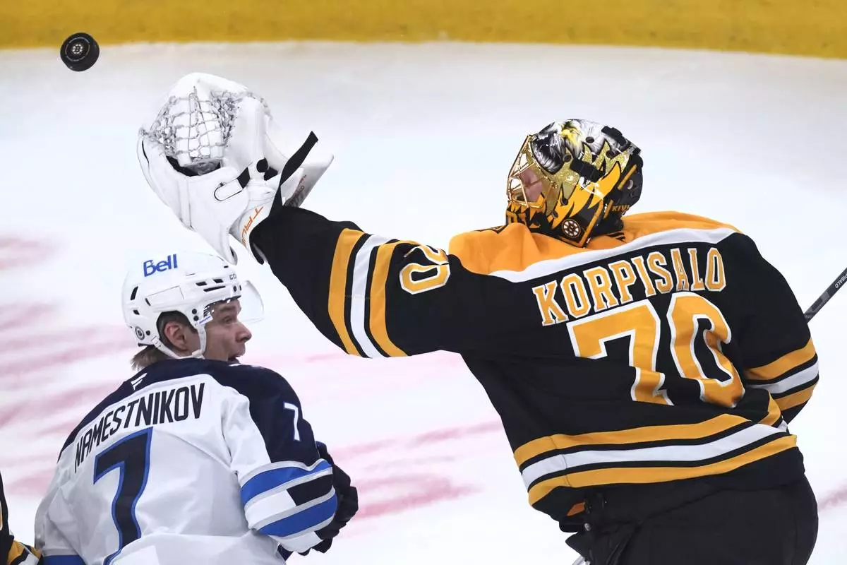 Boston Bruins goaltender Joonas Korpisalo (70) reaches to grab the puck over Winnipeg Jets center Vladislav Namestnikov (7) during the second period of an NHL hockey game, Thursday, Jan. 30, 2025, in Boston. (AP Photo/Charles Krupa)