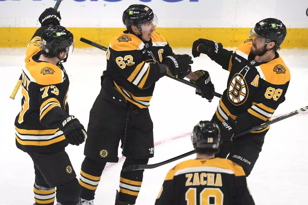 Boston Bruins left wing Brad Marchand (63) is congratulated after his goal against the Winnipeg Jets during the first period of an NHL hockey game, Thursday, Jan. 30, 2025, in Boston. (AP Photo/Charles Krupa)