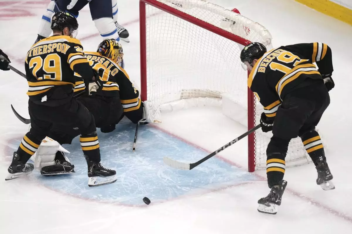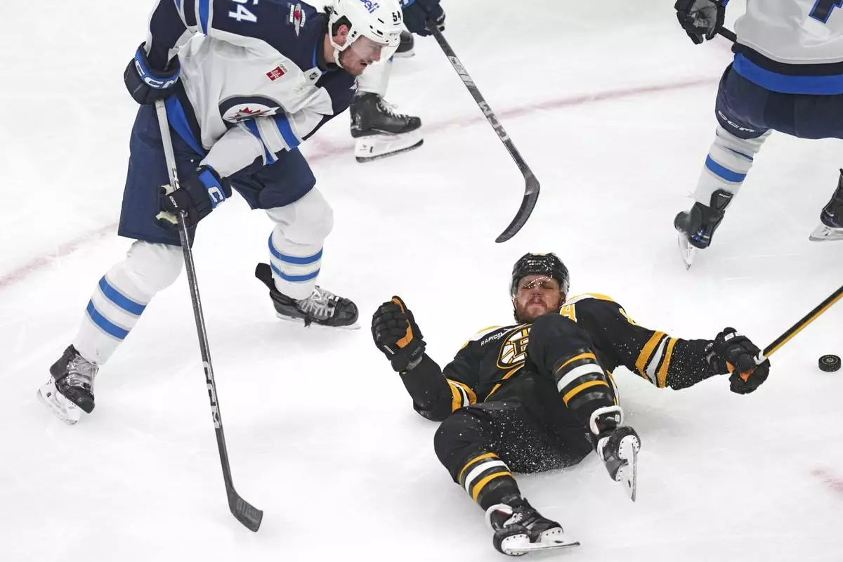 Trailing 2-1 and down a man with Marchand in the penalty box at the start the third period, Boston’s Pavel Zacha won a faceoff and found Lindholm, who muscled it past Hellebuyck to tie it. But 24 seconds later, Scheifele added his second goal of the night, followed by a tap-in from Nikolaj Ehlers to give the Jets a two-goal cushion just 77 seconds into the final period.