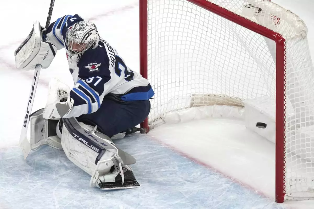 Winnipeg Jets goaltender Connor Hellebuyck fails to make the save on a goal by Boston Bruins left wing Brad Marchand during the first period of an NHL hockey game, Thursday, Jan. 30, 2025, in Boston. (AP Photo/Charles Krupa)