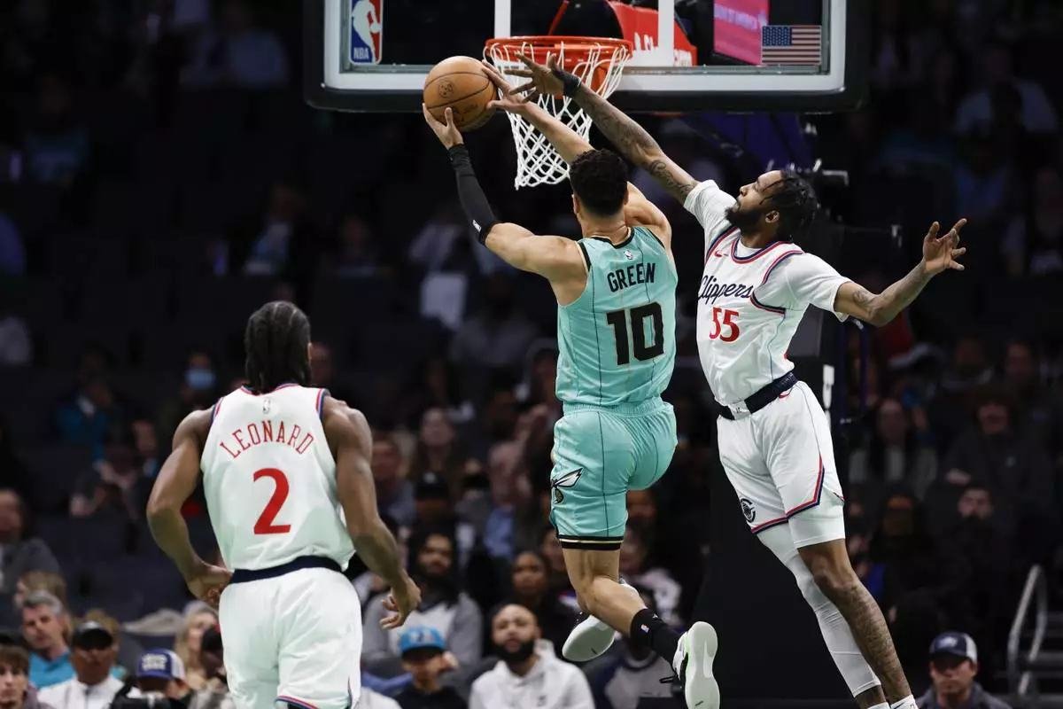 Charlotte Hornets guard Josh Green (10) drives to the basket against Los Angeles Clippers forward Derrick Jones Jr. (55) as Clippers forward Kawhi Leonard watches during the first half of an NBA basketball game in Charlotte, N.C., Friday, Jan. 31, 2025. (AP Photo/Nell Redmond)