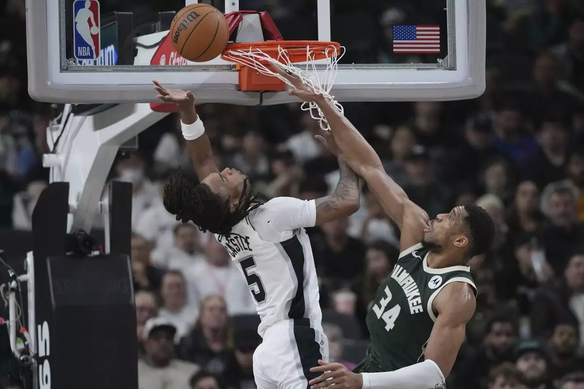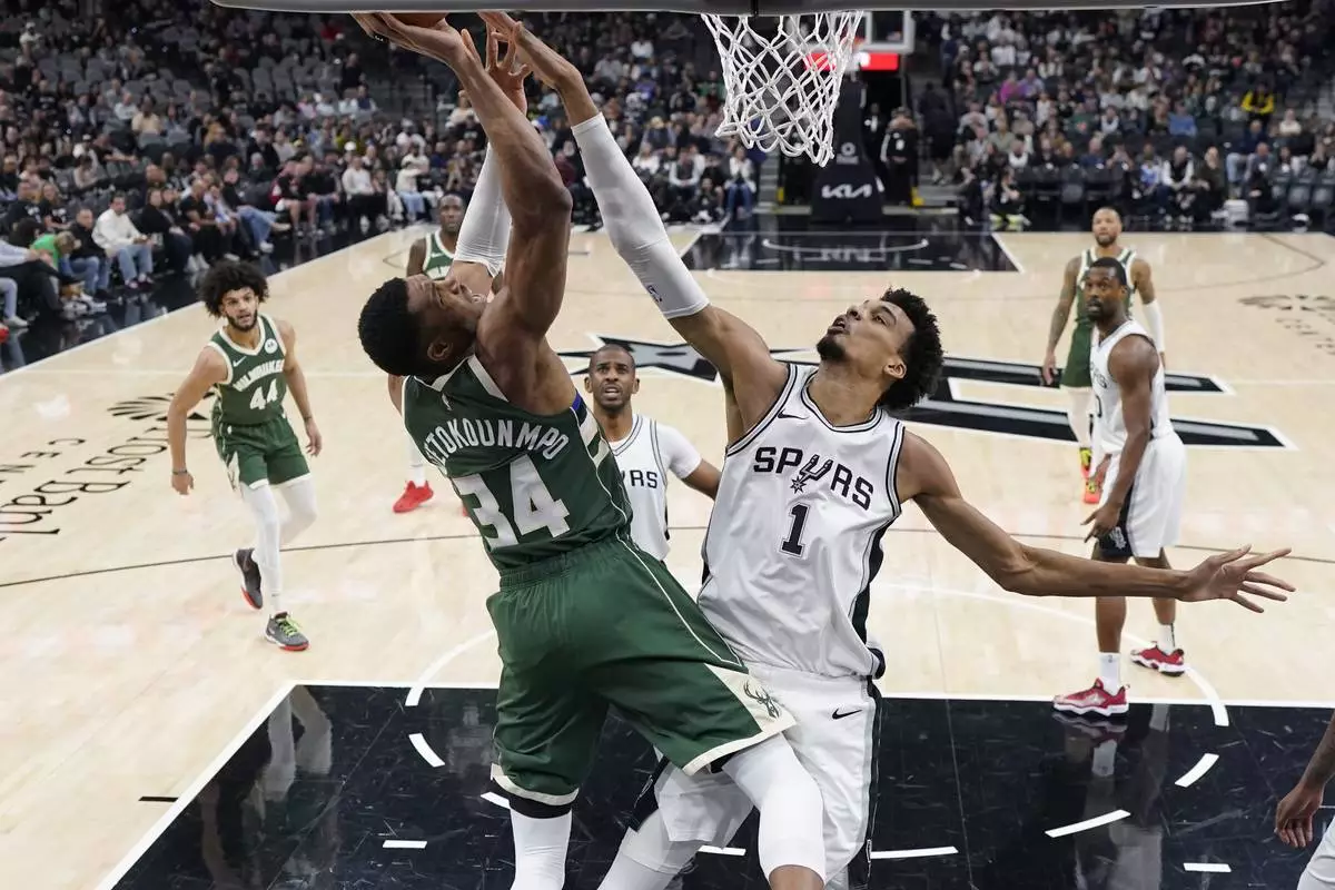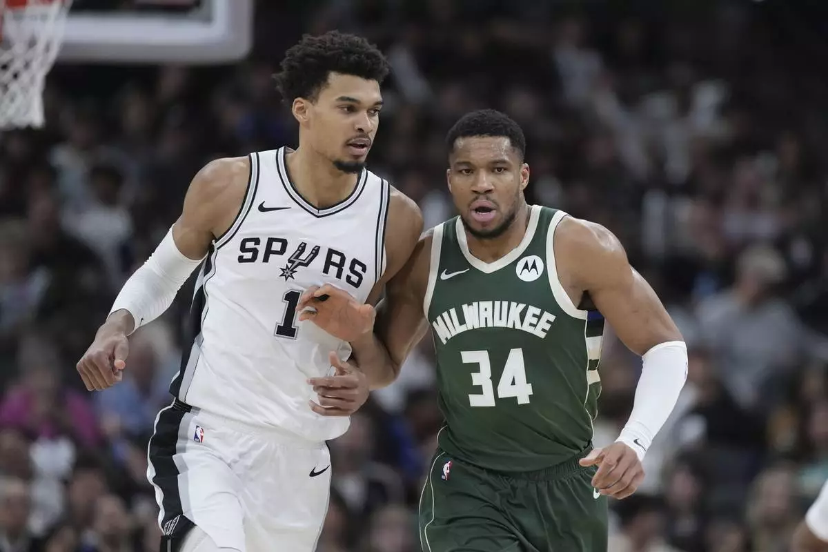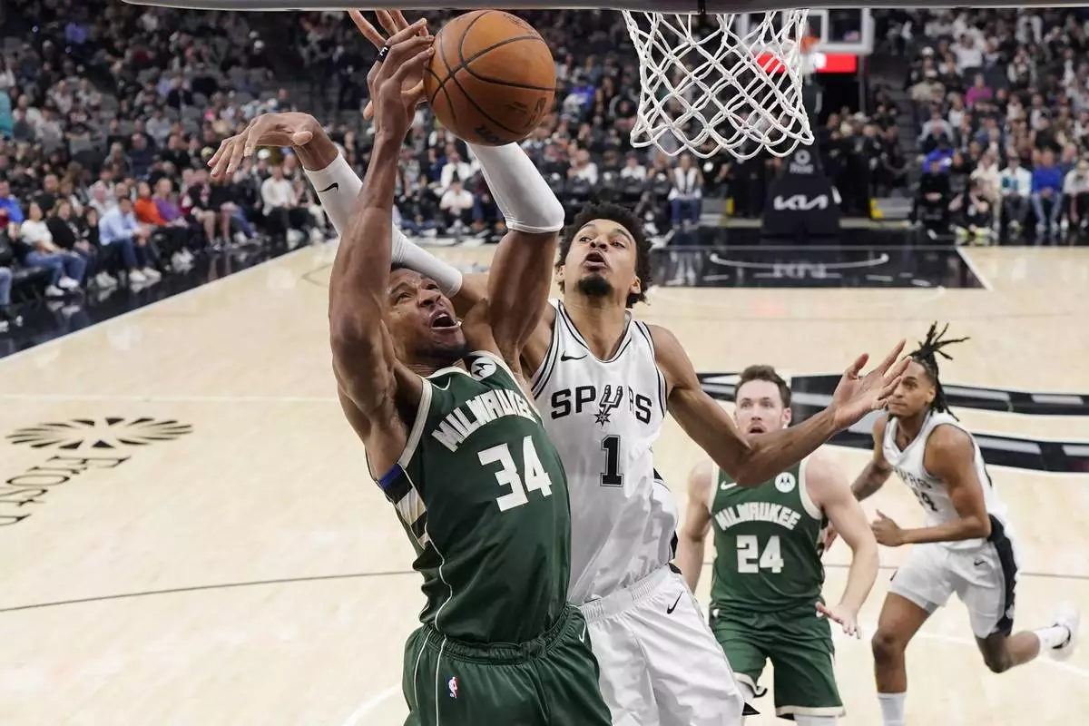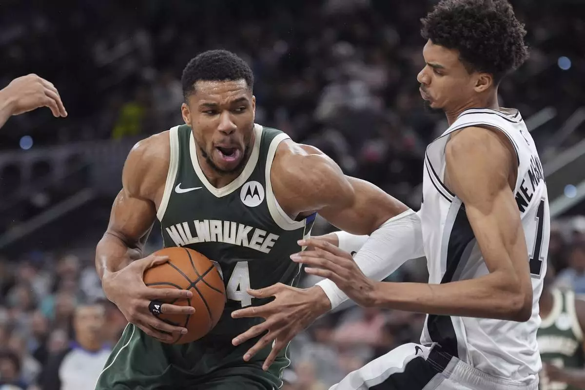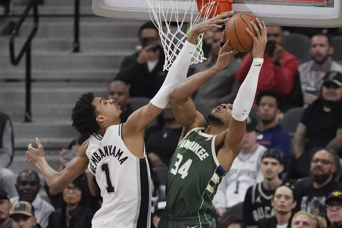 Wembanyama was held to two points on 1-for-4 shooting in the first quarter, but he had three blocks to help San Antonio end the period tied at 35. Wembanyama blocked Antetokounmpo's shots twice in 14 seconds in the opening two minutes of the game. Antetokounmpo avoided a third block by powering in a dunk over Wembanyama.