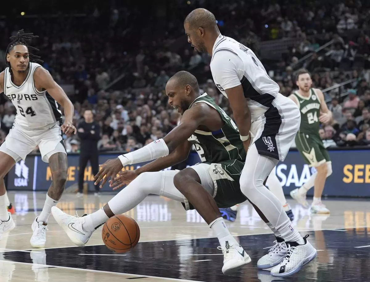 Milwaukee Bucks forward Khris Middleton, center, is fouled by San Antonio Spurs guard Chris Paul, right, during the first half of an NBA basketball game in San Antonio, Friday, Jan. 31, 2025. (AP Photo/Eric Gay)