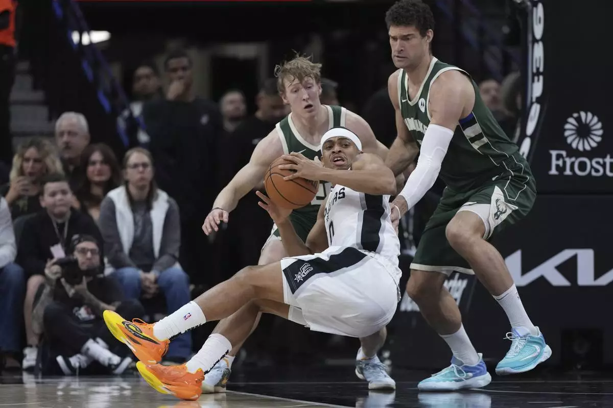 San Antonio Spurs forward Keldon Johnson, front, is fouled as he drives to the basket against Milwaukee Bucks guard AJ Green, left, and Milwaukee Bucks center Brook Lopez, right, during the first half of an NBA basketball game in San Antonio, Friday, Jan. 31, 2025. (AP Photo/Eric Gay)