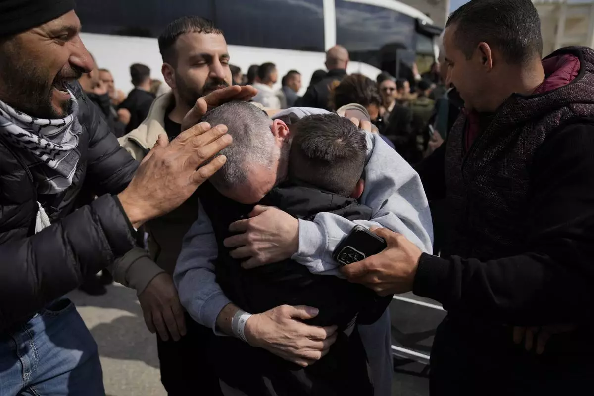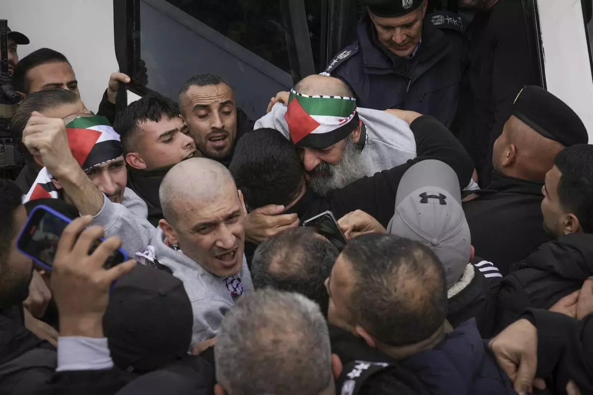 Palestinian prisoners as greeted as they exit a Red Cross bus after being released from Israeli prison following a ceasefire agreement between Israel and Hamas, in the West Bank city of Ramallah, Saturday Feb. 1, 2025. (AP Photo/Mahmoud Illean)