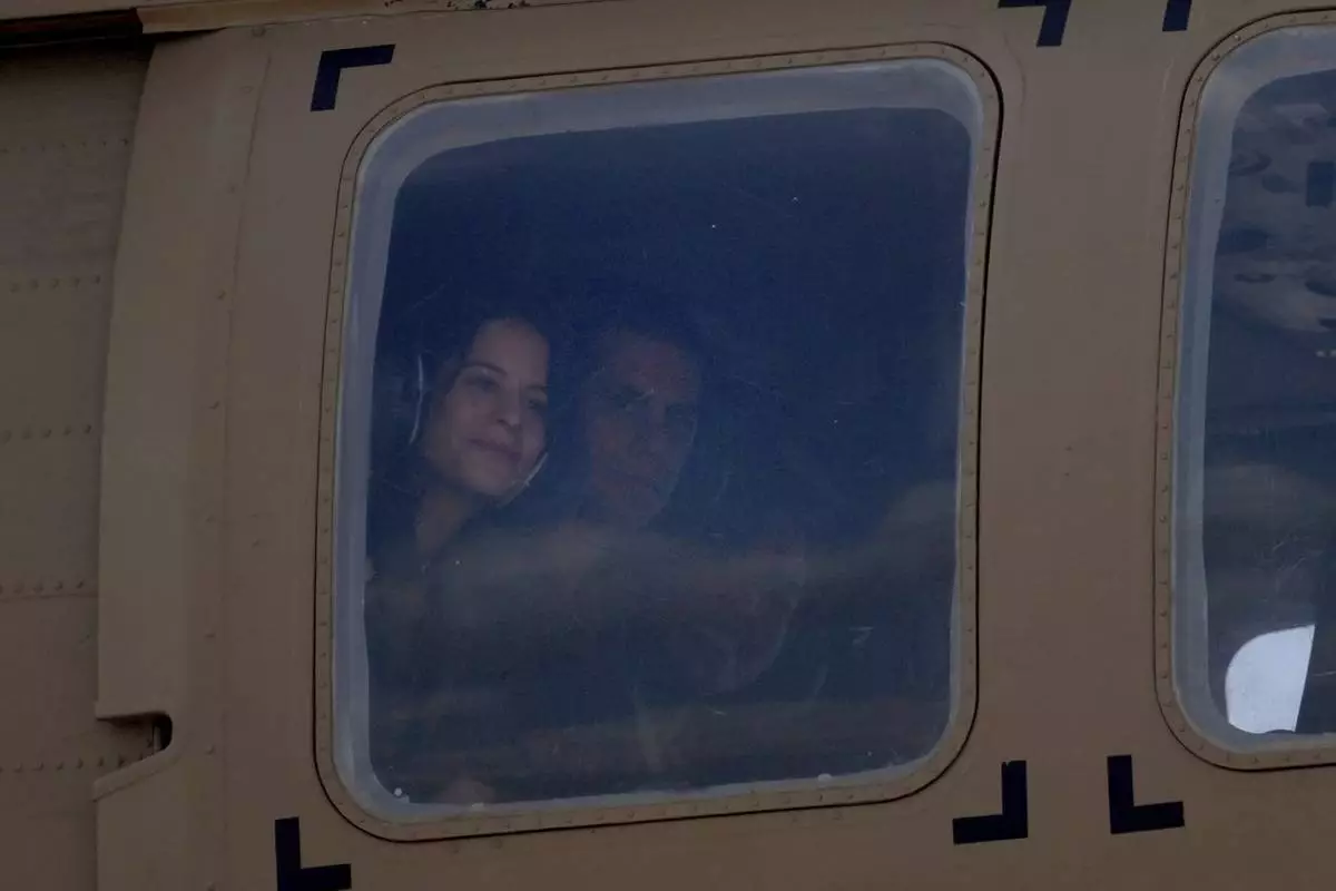 Israeli Ofer Kalderon, who has been held hostage by Hamas in Gaza since October 7, 2023, is seen inside an Israeli helicopter as they land at Sheba medical Center in Ramat Gan, Saturday Feb. 1, 2025. (AP Photo/Ariel Schalit)