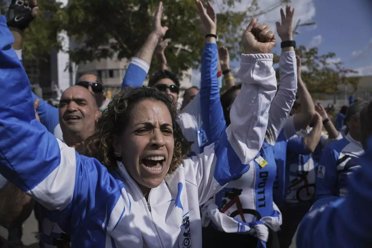 Cycling friends of Ofer Kalderon celebrate his release as part of a ceasefire in the Gaza Strip, at Sheba medical Center in Ramat Gan, Saturday Feb. 1, 2025. (AP Photo/Maya Alleruzzo)