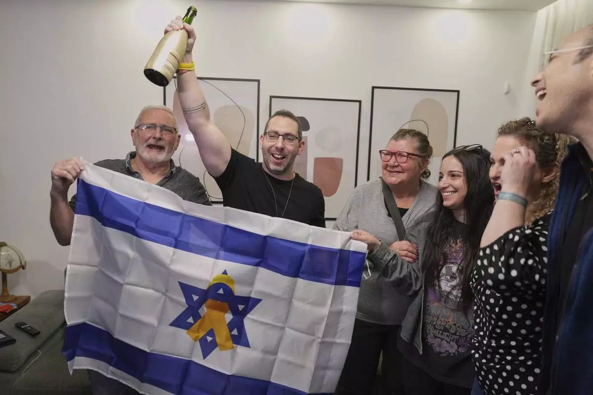 Family of Israeli hostage Ofer Kalderon react as they watch the broadcast of him being released from Hamas captivity, in Kfra Saba, southern Israel, Saturday Feb. 1, 2025, as part of the Israel-Hamas ceasefire deal. (AP Photo/Ariel Schalit)
