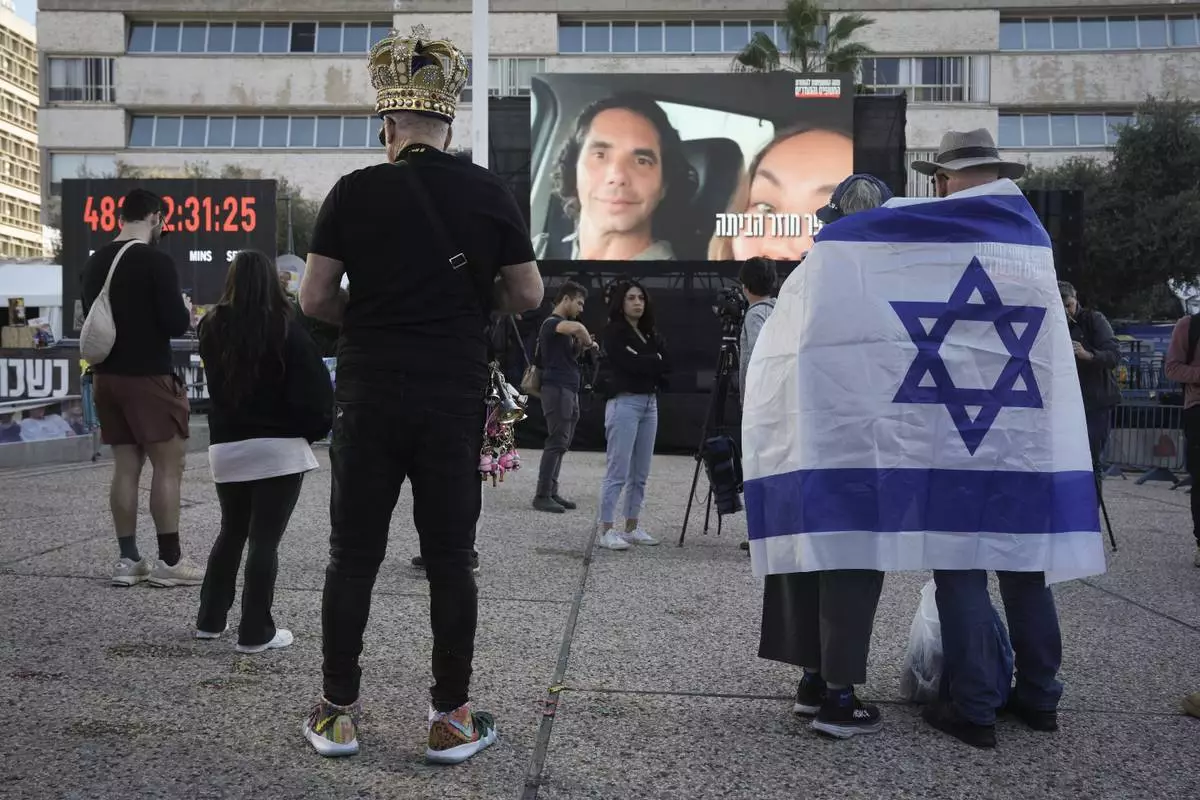 Israelis watch a broadcast of the release of Israelis Ofer Kalderon, 53, and Yarden Bibas, 34, and American-Israeli Keith Siegel, 65 set to be released as part of a ceasefire in the Gaza Strip, in Tel Aviv, Israel, Saturday Feb. 1, 2025. (AP Photo/Oded Balilty3