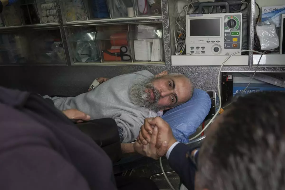 Palestinian prisoner Hussam Shaheen is greeted as he is taken in an ambulance for a medical check after being released from an Israeli prison following a ceasefire agreement between Israel and Hamas, in the West Bank city of Ramallah, Saturday Feb. 1, 2025. (AP Photo/Mahmoud Illean)