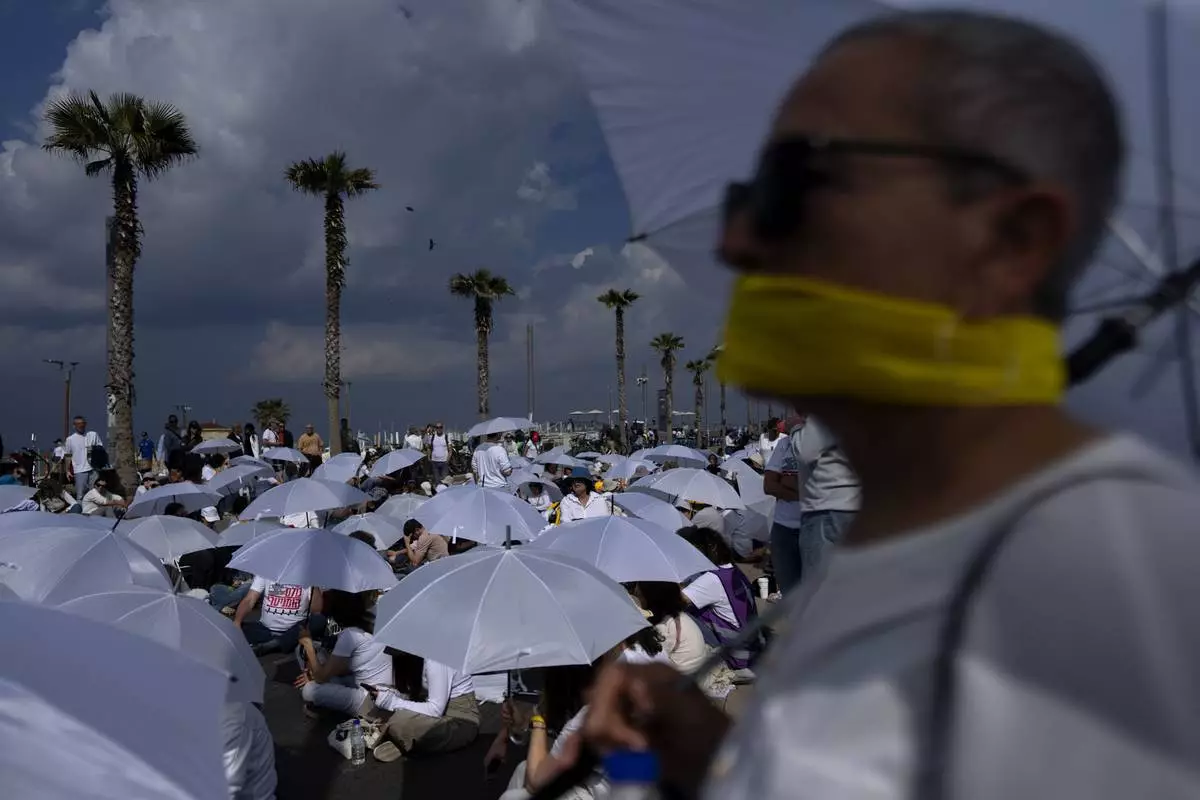 Activists sit on a road with white umbrellas during a protest calling for the release of hostages held in the Gaza Strip, in front of the U.S. Embassy branch office in Tel Aviv, Israel, Friday, Jan. 31, 2025. (AP Photo/Oded Balilty)