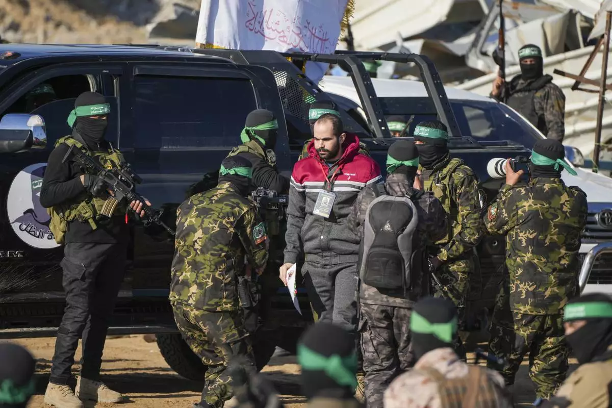 Israeli Ofer Kalderon who has been held hostage by Hamas in Gaza since October 7, 2023, walks next to Hamas fighters before being handed over to the Red Cross by Hamas fighters in Khan Younis, southern Gaza Strip, Saturday Feb. 1, 2025. Photo/Abdel Kareem)