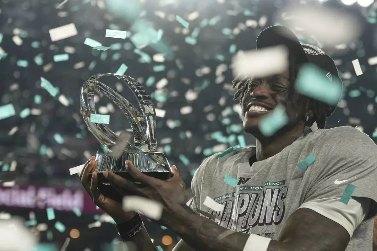 Philadelphia Eagles wide receiver A.J. Brown holds the championship trophy after the Eagles won the NFC Championship NFL football game against the Washington Commanders, Sunday, Jan. 26, 2025, in Philadelphia. (AP Photo/Matt Slocum)