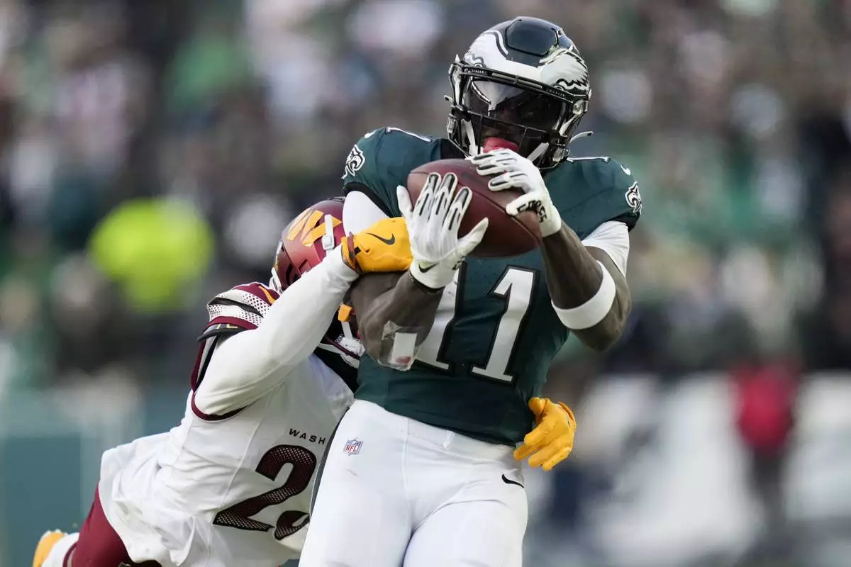 DeVonta Smith, who topped 1,000 yards receiving the previous two seasons, also missed four games but led the Eagles with 68 catches and had 833 yards receiving. Tight end Dallas Goedert — who threw three stiff-arms in a playoff touchdown against Green Bay — and even 2,000-yard rusher Saquon Barkley are regular threats to catch the ball.