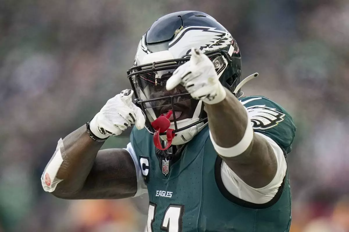 Philadelphia Eagles wide receiver A.J. Brown celebrates after a first down against the Washington Commanders during the first half of the NFC Championship NFL football game, Sunday, Jan. 26, 2025, in Philadelphia. (AP Photo/Seth Wenig)