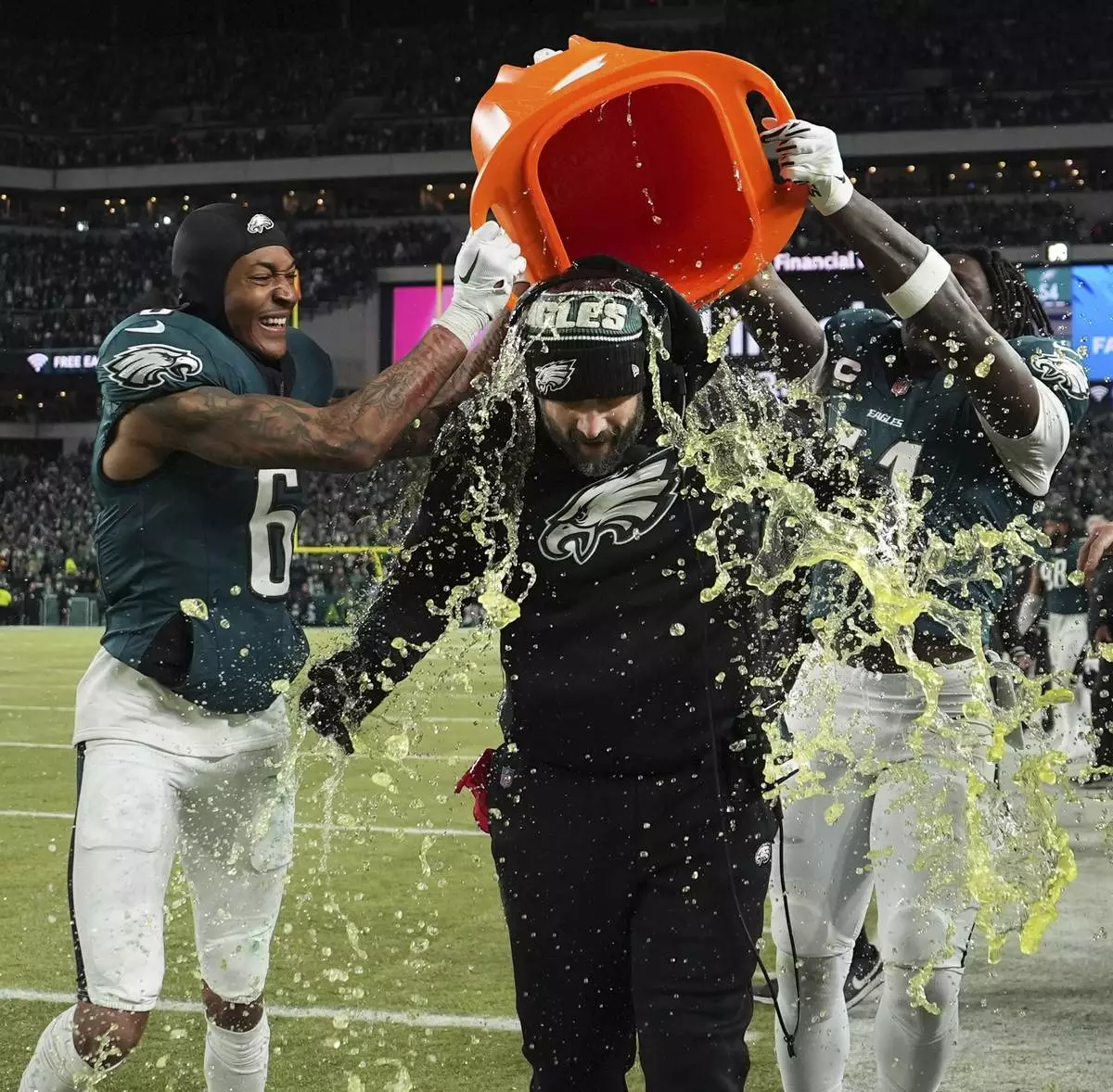 Philadelphia Eagles coach Nick Sirianni, center, is dunked by DeVonta Smith (6) and A.J. Brown (11) during the closing minutes of the second half of the NFC Championship NFL football game against the Washington Commanders, Sunday, Jan. 26, 2025, in Philadelphia. (AP Photo/Matt Slocum)