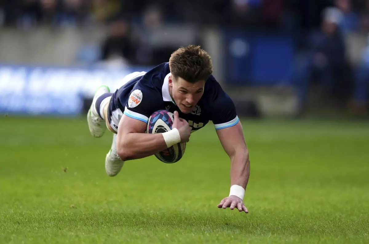 Scotland's Rory Darge scores the opening try during the Six Nations rugby union match between Scotland and Italy, at Murrayfield Stadium, Edinburgh, Scotland, Saturday Feb. 1, 2025. (Andrew Milligan/PA via AP)