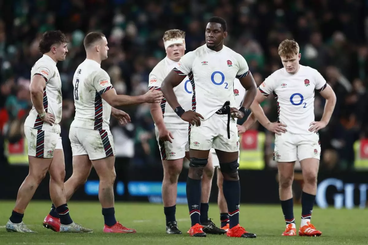 England's Maro Itoje stands on the pitch with teammates after his side lost the Six Nations rugby union match between Ireland and England at the Aviva Stadium in Dublin, Saturday, Feb. 1, 2025. (AP Photo/Peter Morrison)