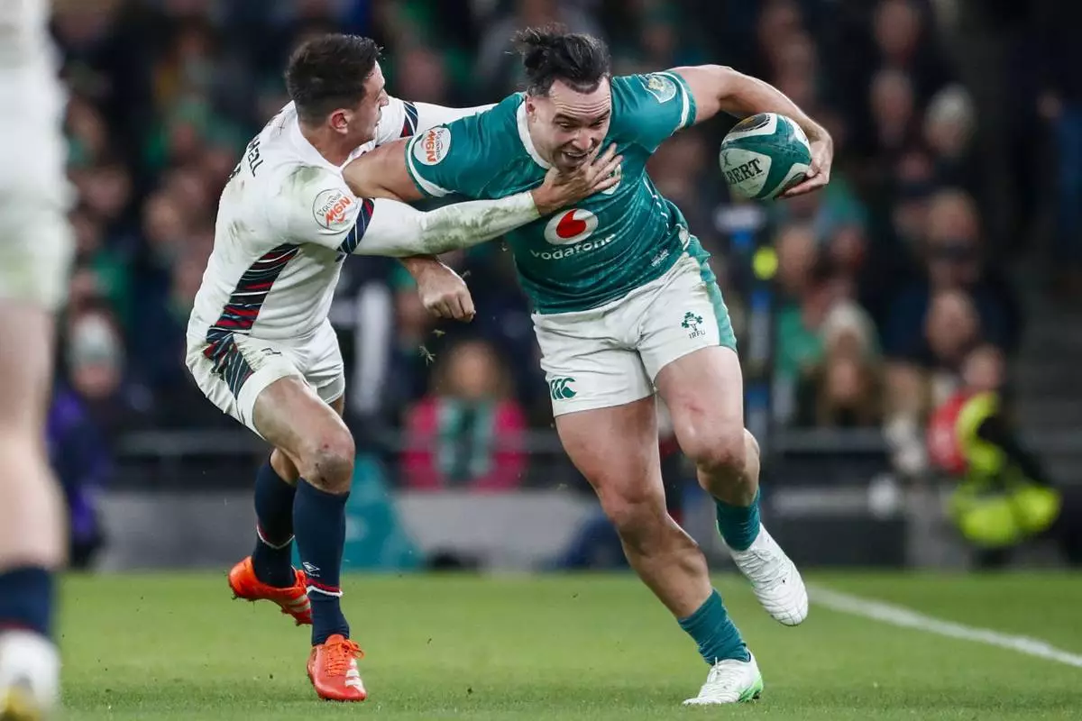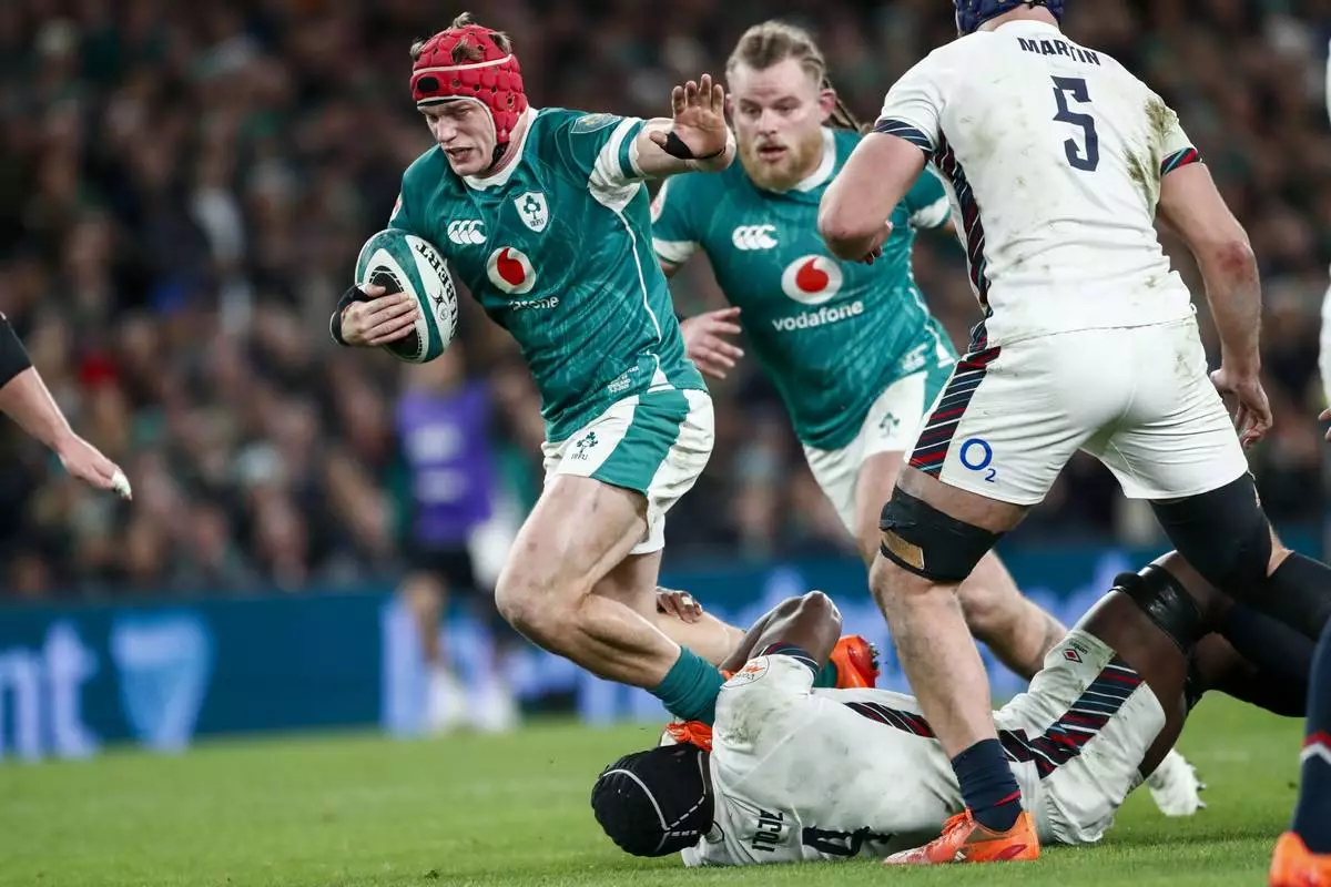 Ireland's James Lowe, right, breaks the tackle of England's Alex Mitchell during the Six Nations rugby union match between Ireland and England at the Aviva Stadium in Dublin, Saturday, Feb. 1, 2025. (AP Photo/Peter Morrison)