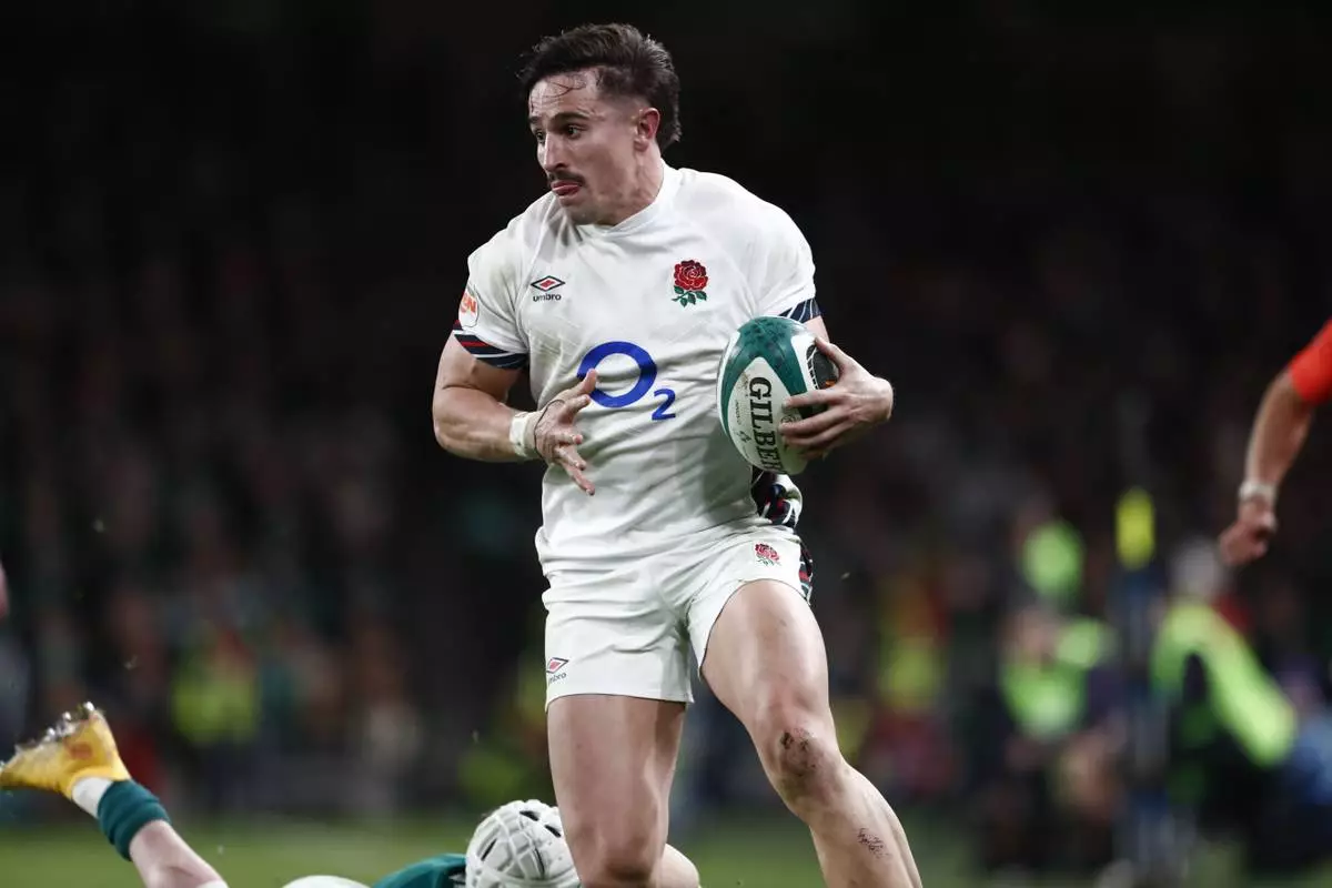 England's Cadan Murley runs with the ball during the Six Nations rugby union match between Ireland and England at the Aviva Stadium in Dublin, Saturday, Feb. 1, 2025. (AP Photo/Peter Morrison)