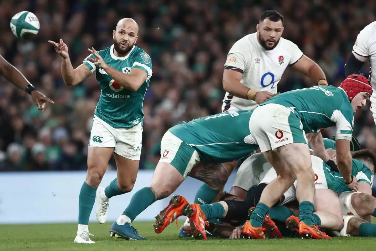 Ireland's Jamison Gibson-Park passes the ball during the Six Nations rugby union match between Ireland and England at the Aviva Stadium in Dublin, Saturday, Feb. 1, 2025. (AP Photo/Peter Morrison)