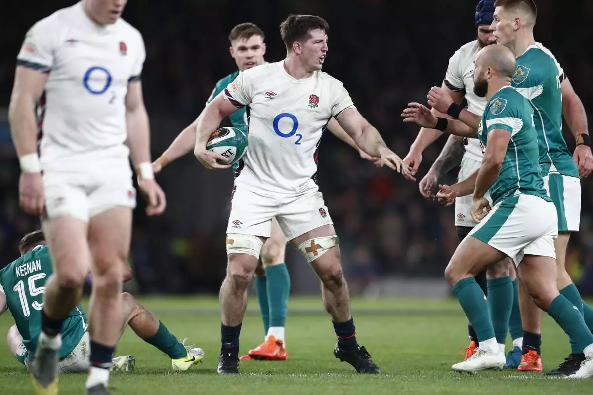 England's Ben Curry holds the ball during the Six Nations rugby union match between Ireland and England at the Aviva Stadium in Dublin, Saturday, Feb. 1, 2025. (AP Photo/Peter Morrison)