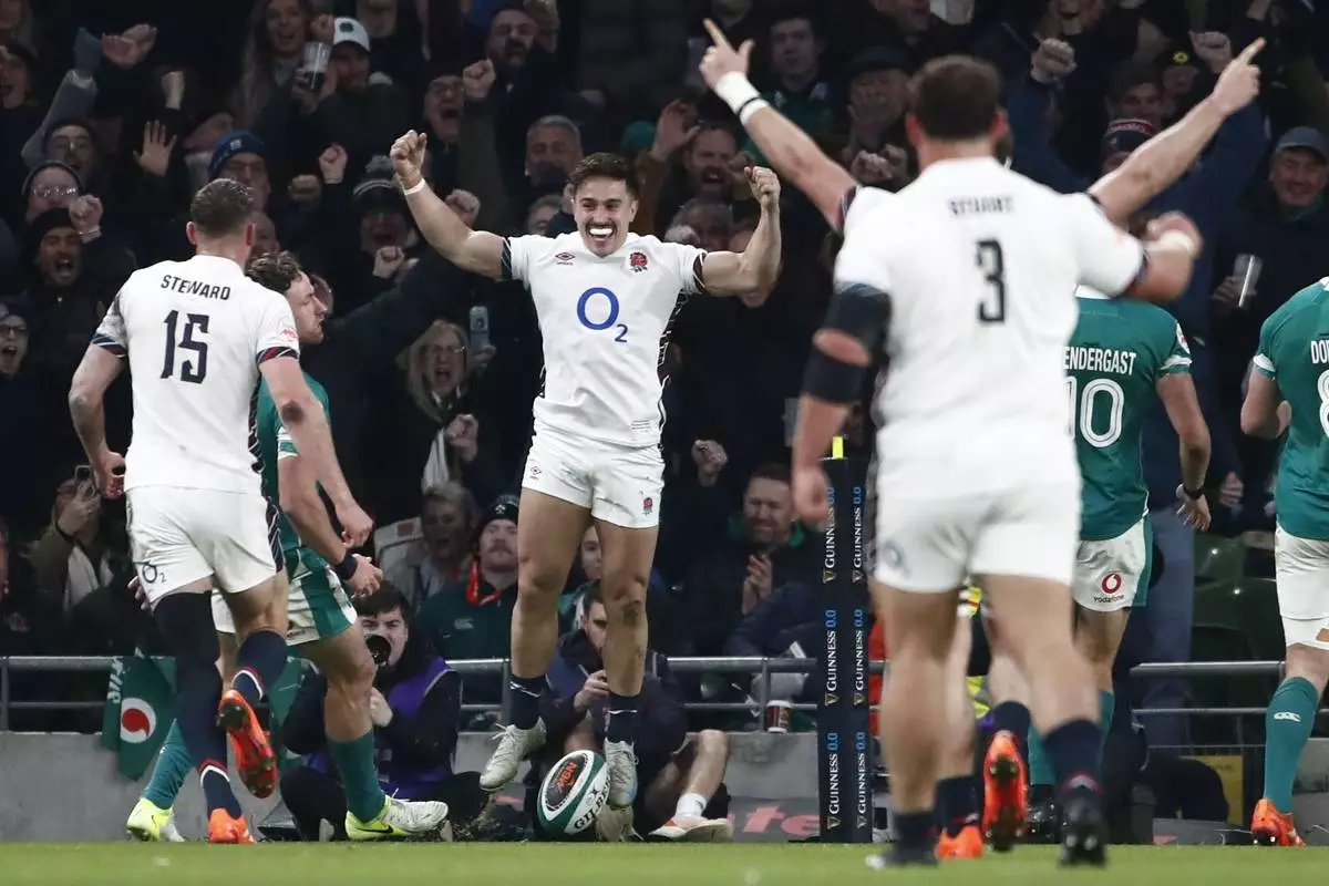 England's Cadan Murley, center, celebrates after scoring the opening try during the Six Nations rugby union match between Ireland and England at the Aviva Stadium in Dublin, Saturday, Feb. 1, 2025. (AP Photo/Peter Morrison)