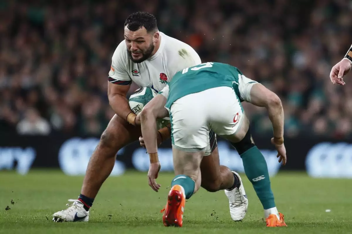 England's Ellis Genge on the charge during the Six Nations rugby union match between Ireland and England at the Aviva Stadium in Dublin, Saturday, Feb. 1, 2025. (AP Photo/Peter Morrison)