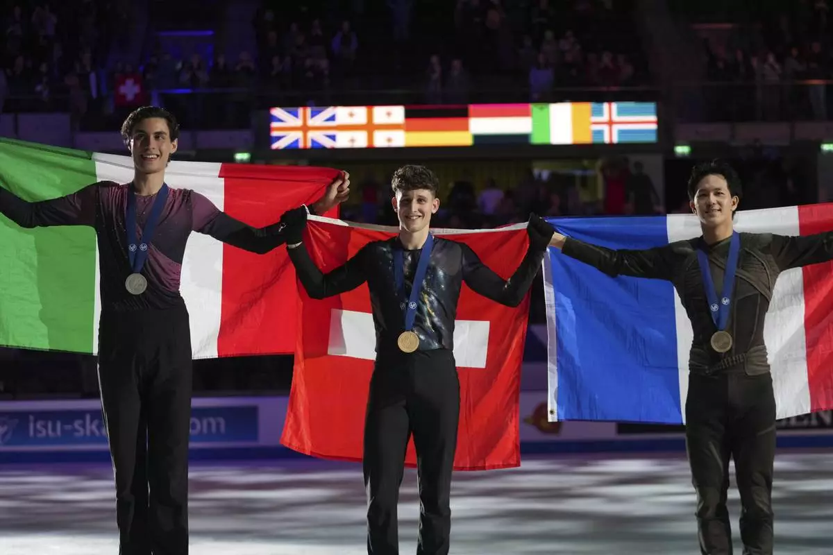 Gold medalist Lukas Britschgi of Switzerland, centre, silver medalist Nikolaj Memola of Italy, left, and bronze medalist Adam Siao Him Fa of France pose with their medals during the victory ceremony for the men's free skating competition at the ISU European Figure Skating Championships in Tallinn, Estonia, Saturday, Feb. 1, 2025. (AP Photo/Sergei Grits)