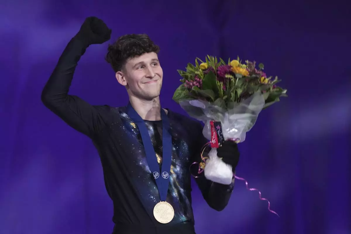 Gold medalist Lukas Britschgi of Switzerland poses with his medal during the victory ceremony for the men's free skating competition at the ISU European Figure Skating Championships in Tallinn, Estonia, Saturday, Feb. 1, 2025. (AP Photo/Sergei Grits)