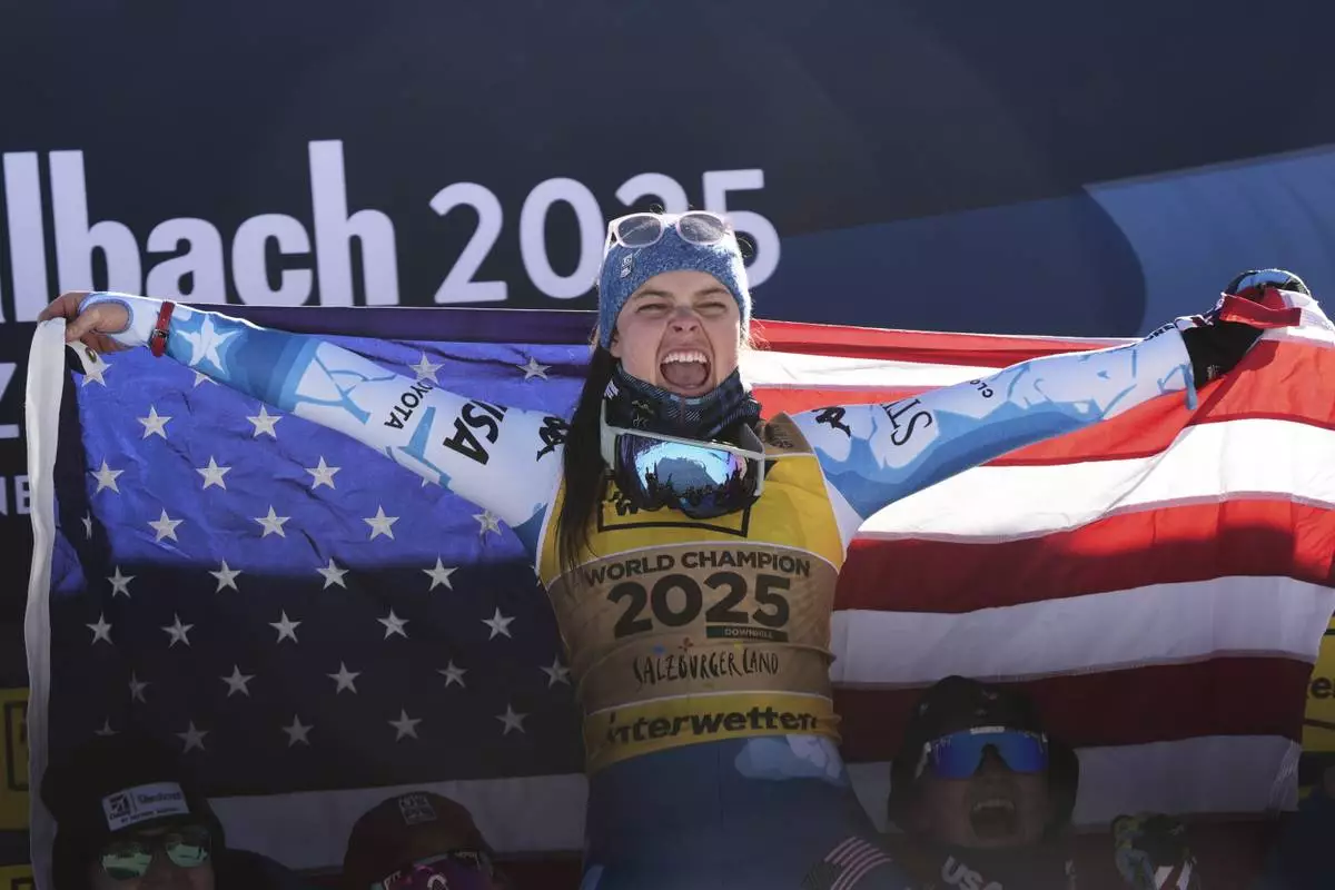 United States' Breezy Johnson celebrates on the podium after winning the gold medal in a women's downhill race, at the Alpine Ski World Championships, in Saalbach-Hinterglemm, Austria, Saturday, Feb. 8, 2025. (AP Photo/Giovanni Auletta)