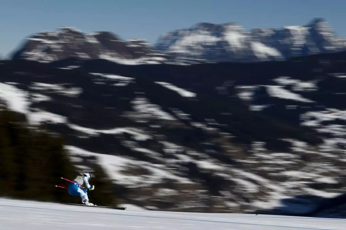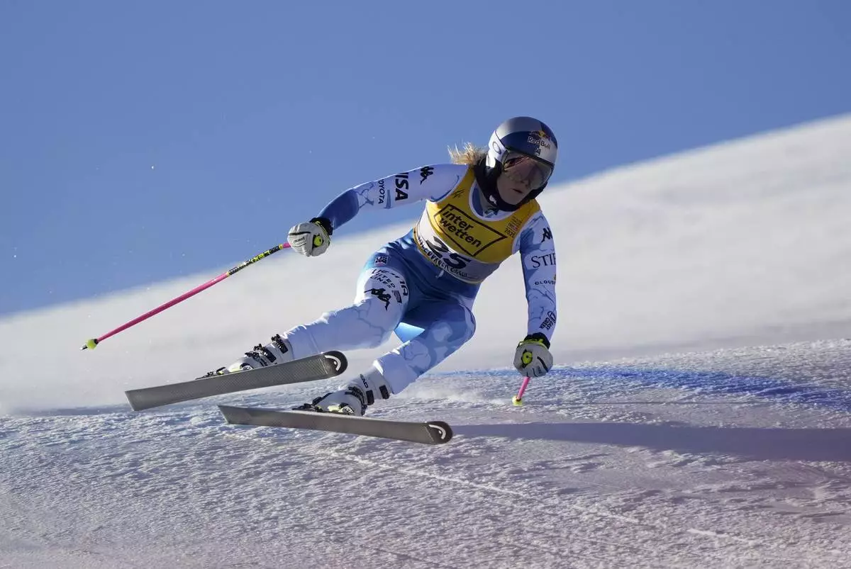 United States' Lindsey Vonn speeds down the course during an alpine ski, women's World Championship downhill training, in Saalbach-Hinterglemm, Austria, Tuesday, Feb. 4, 2025. (AP Photo/Marco Trovati)