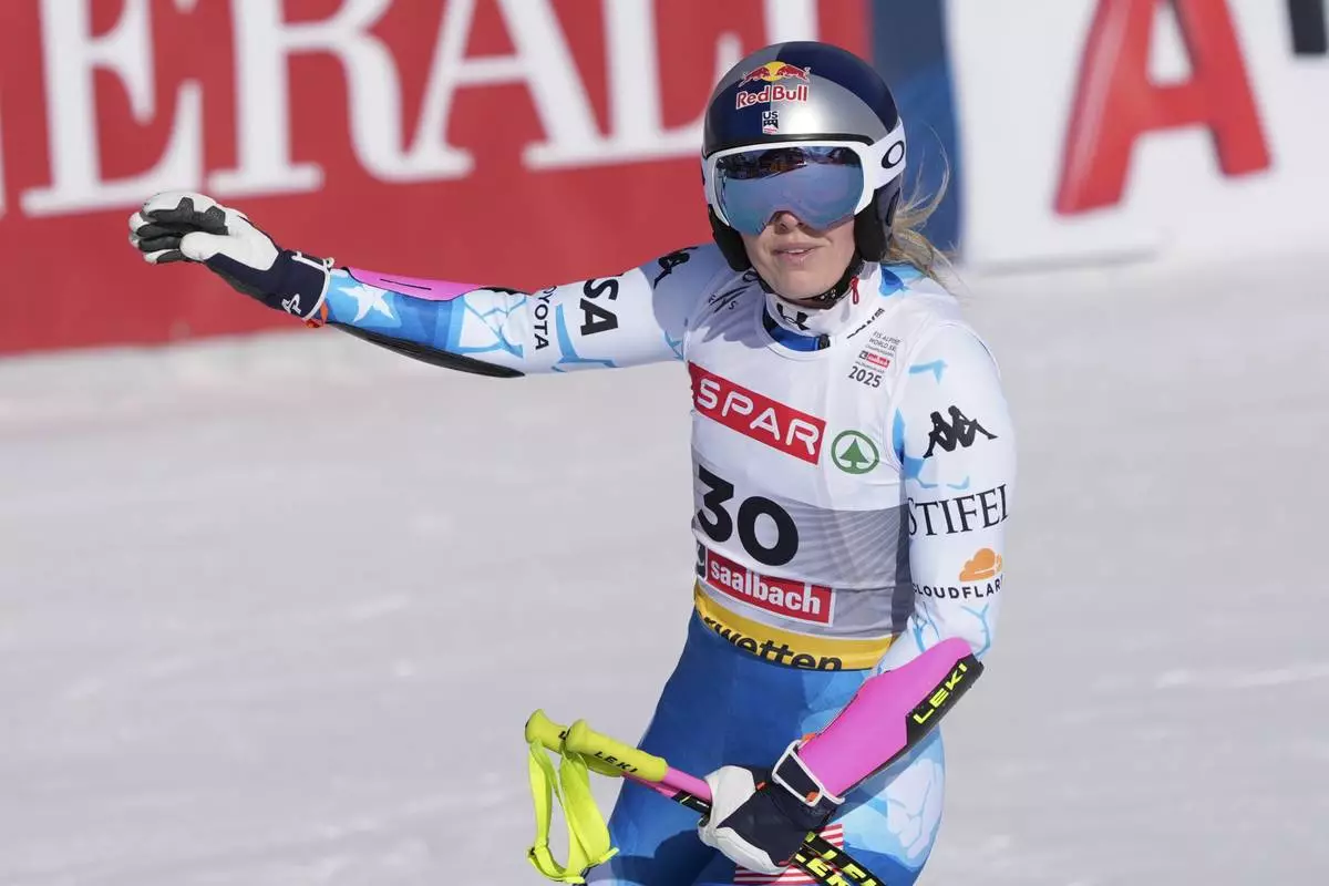 United States' Lindsey Vonn reacts after completing an alpine ski, women's World Cup super G, in Garmisch, Germany, Sunday, Jan. 26, 2025. (AP Photo/Piermarco Tacca)