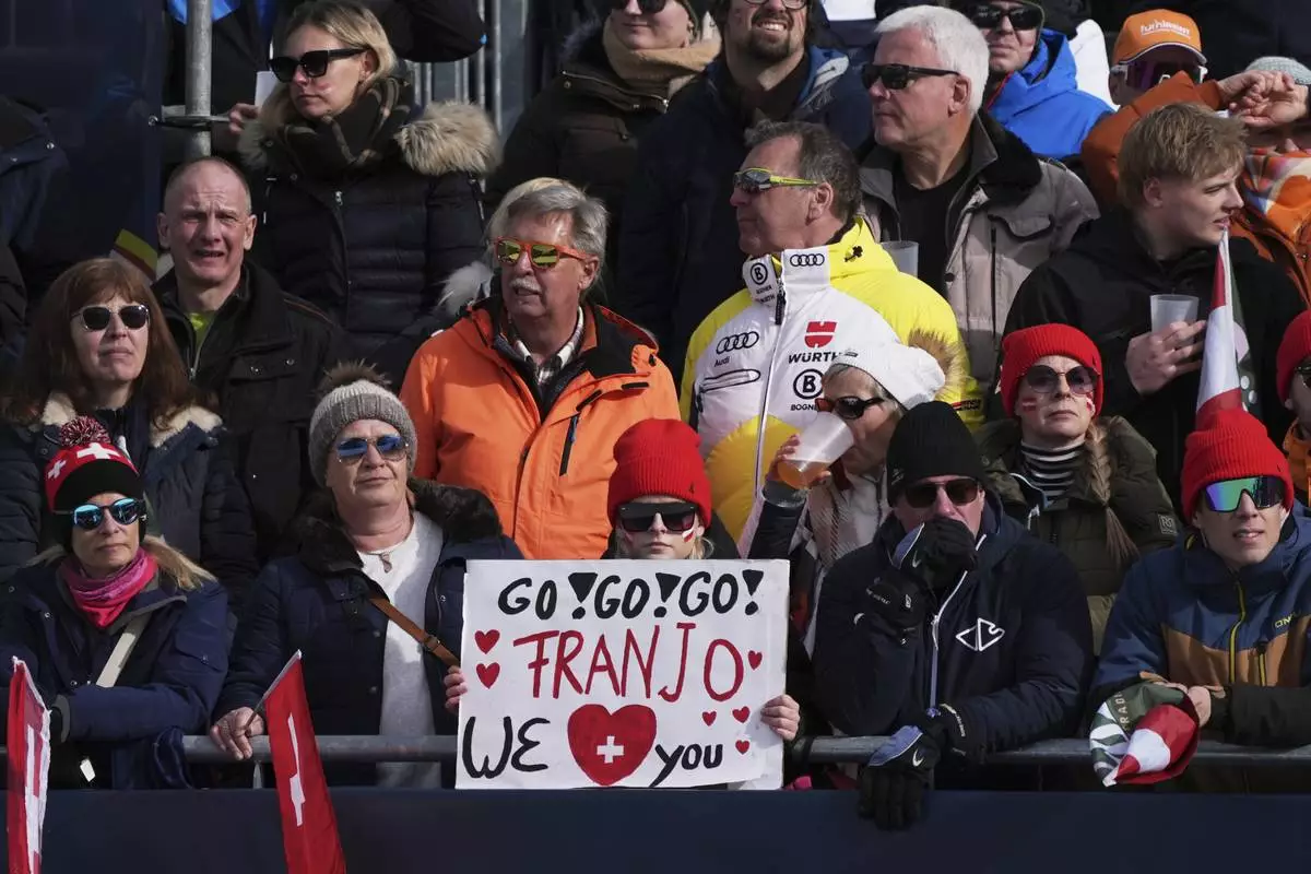 Fans hold a banner for Switzerland's Franjo von Allmen at the finish area of a men's downhill race, at the Alpine Ski World Championships, in Saalbach-Hinterglemm, Austria, Sunday, Feb. 9, 2025. (AP Photo/Giovanni Auletta)