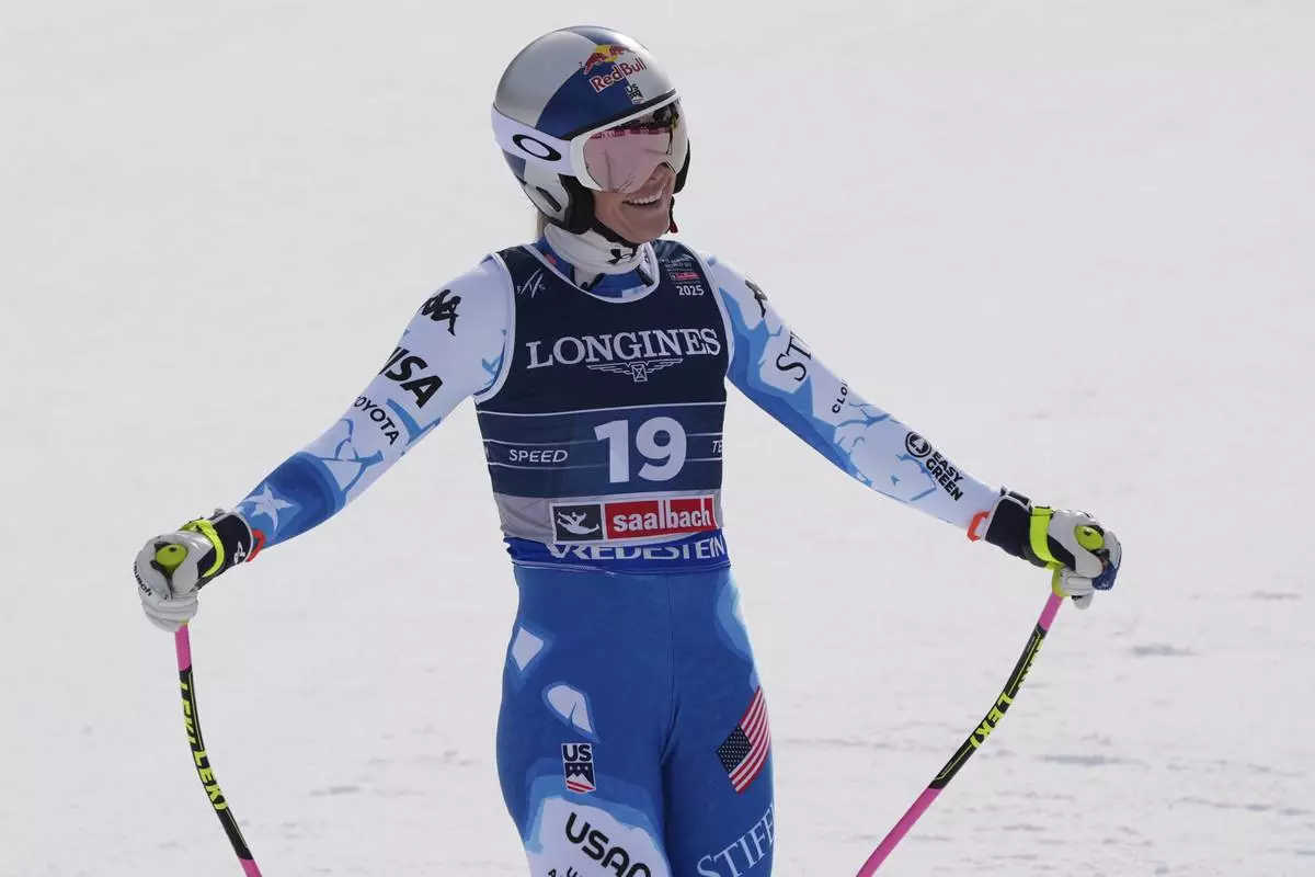 United States' Lindsey Vonn smiles at the finish area of a downhill run of a women's team combined event, at the Alpine Ski World Championships, in Saalbach-Hinterglemm, Austria, Tuesday, Feb. 11, 2025. (AP Photo/Giovanni Auletta)